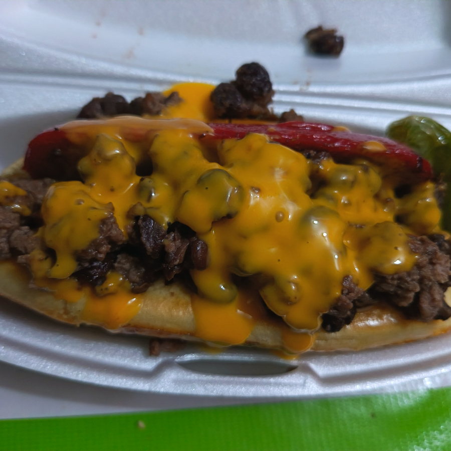 HOT DOG CON SALCHICHA PARA ASAR, CHILI, QUESO AMARILLO Y CHILES