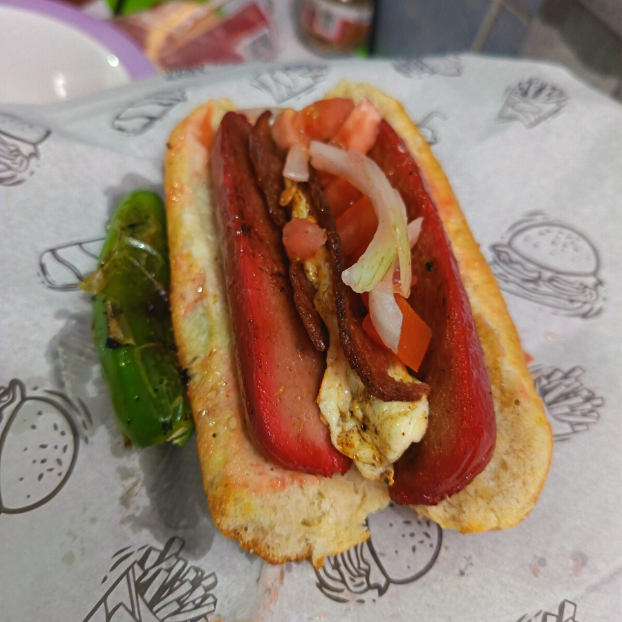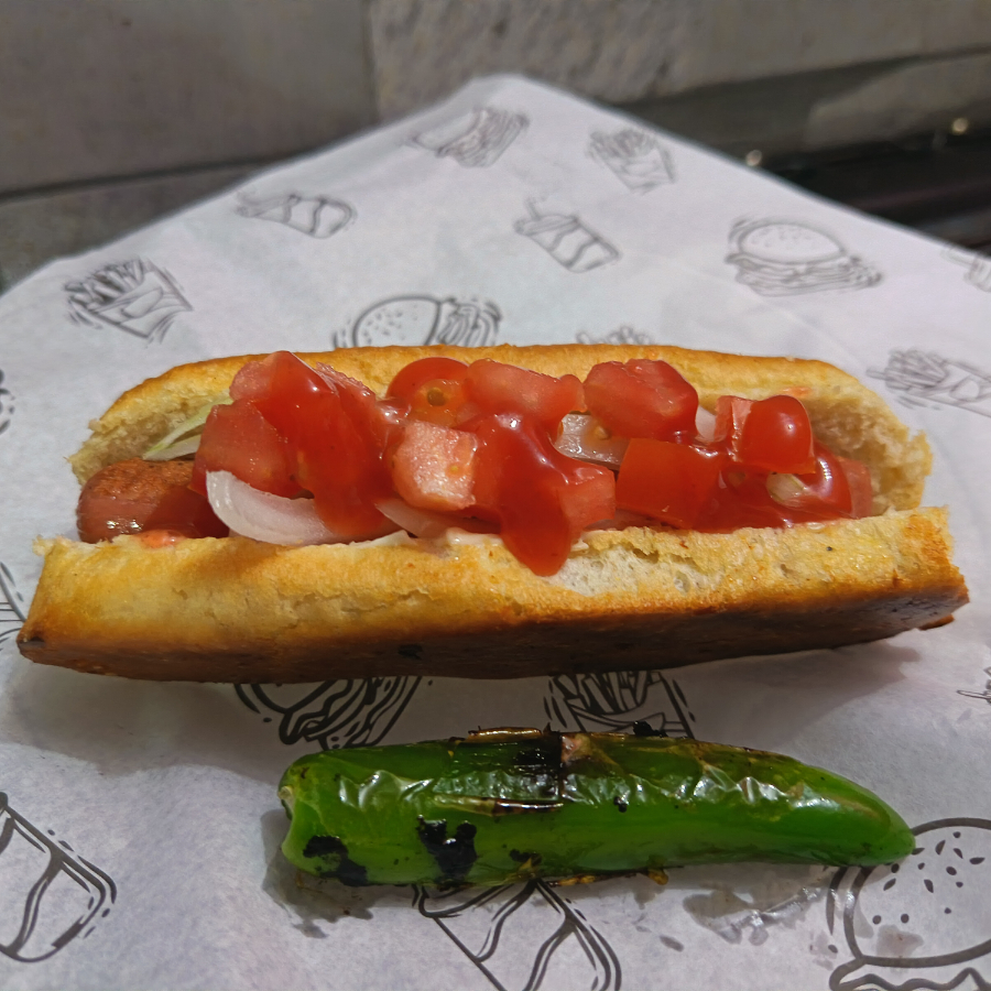 HOT DOG CON SALCHICHA PARA ASAR RELLENA DE QUESILLO, TOCINO, ADEREZOS, CEBOLLA Y JITOMATE