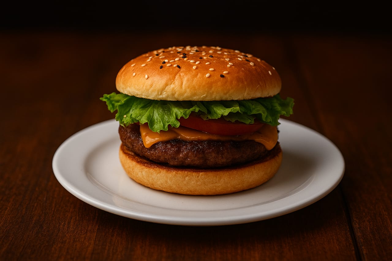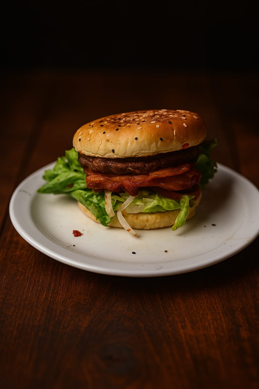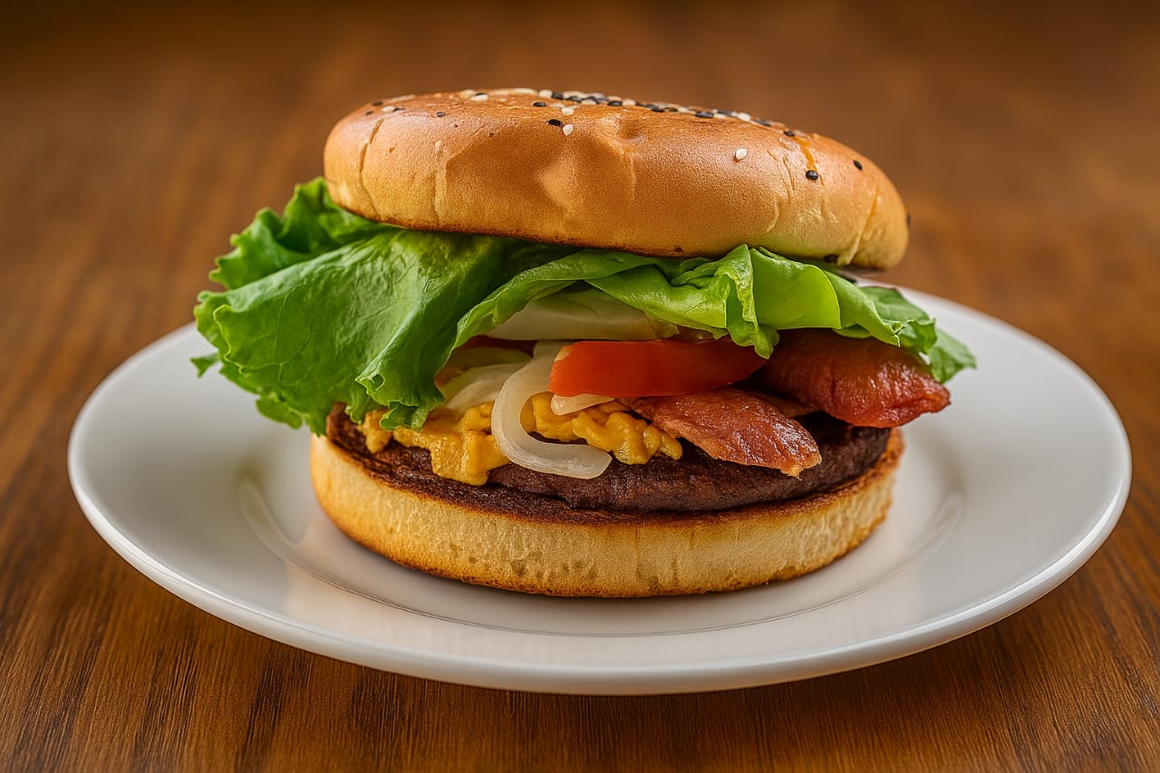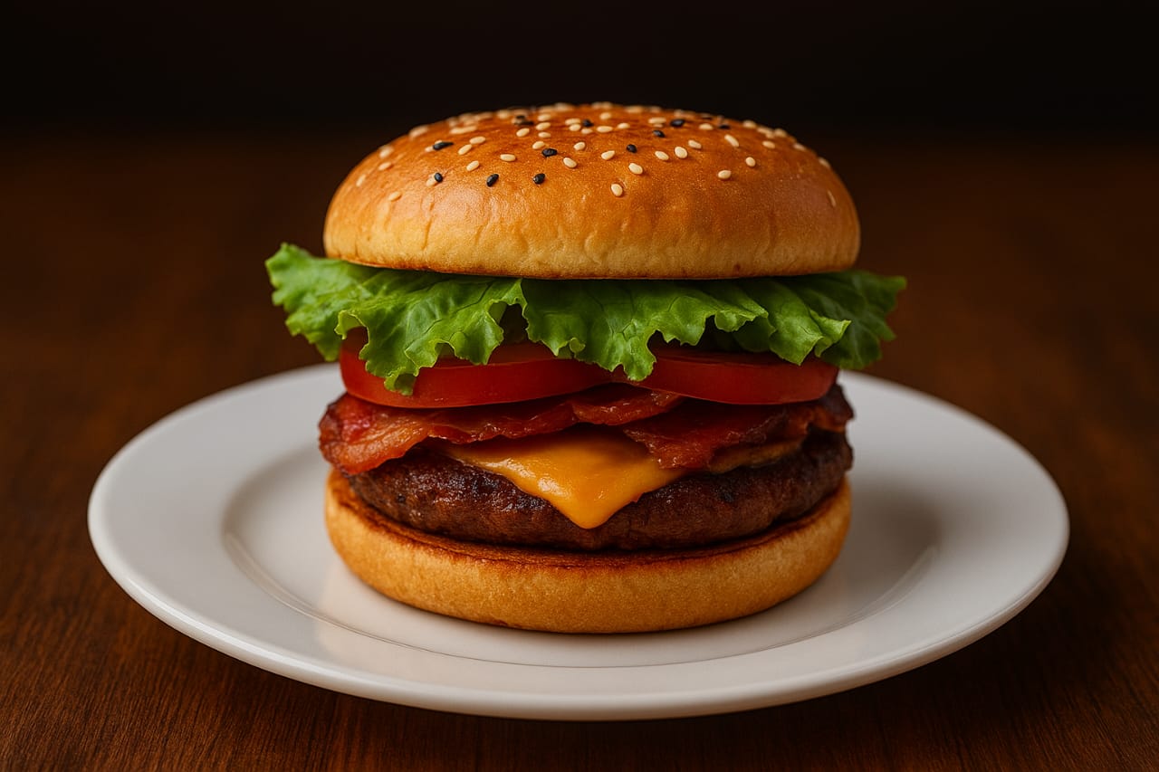 Hamburguesa de carne de res, con tocino, con jamón, quesillo y queso amarillo.