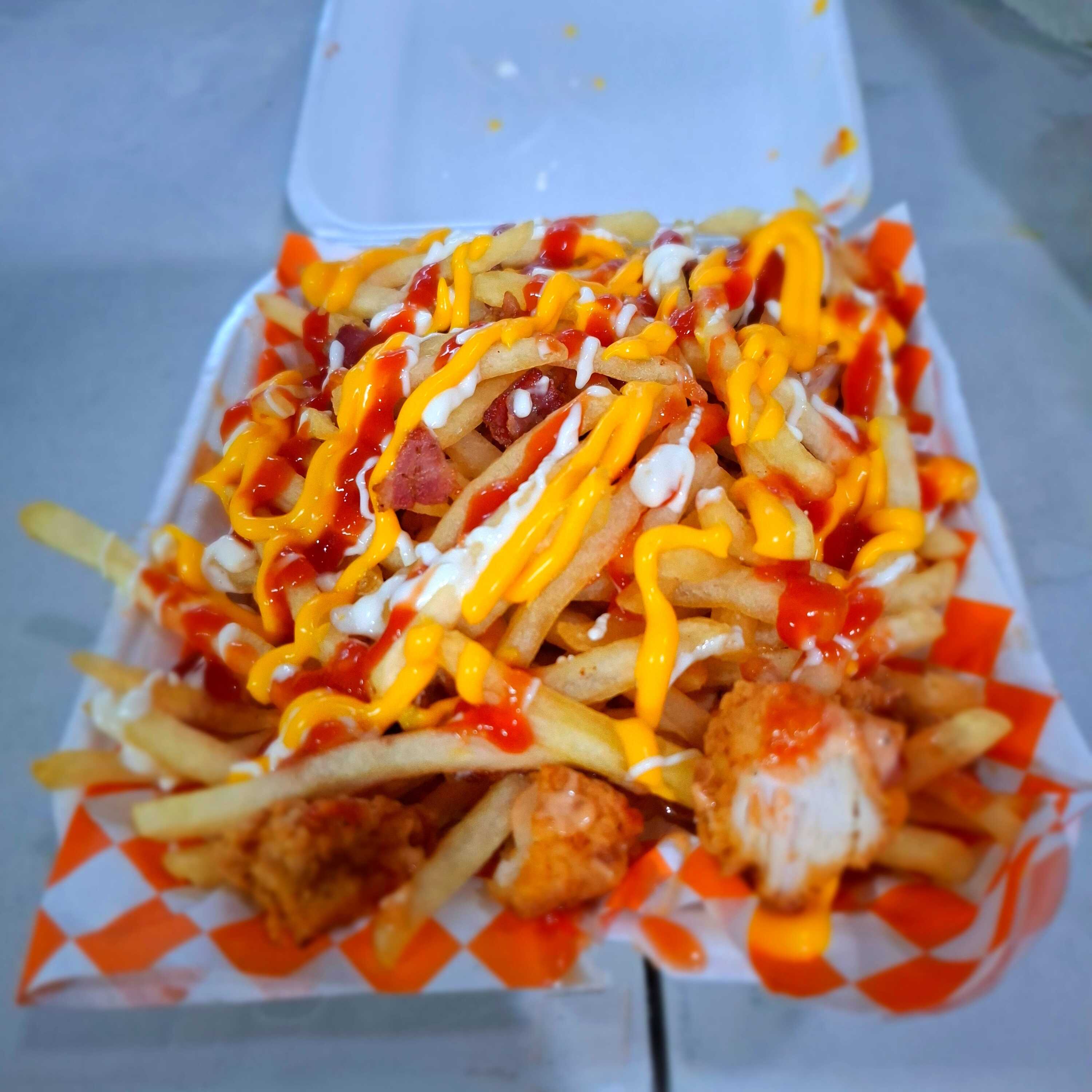 Papas, boneles, tocino, salchicha,queso amarillo, mayonesa, capsu, salsa Raising