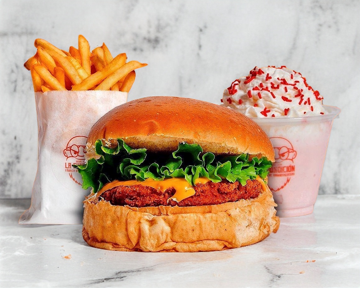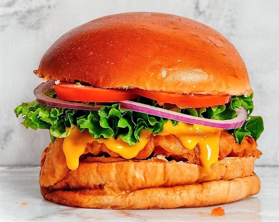 Crujiente pechuga empanizada, queso americano, con nuestro aderezo maestro especial con lechuga, tomate, cebolla y chile