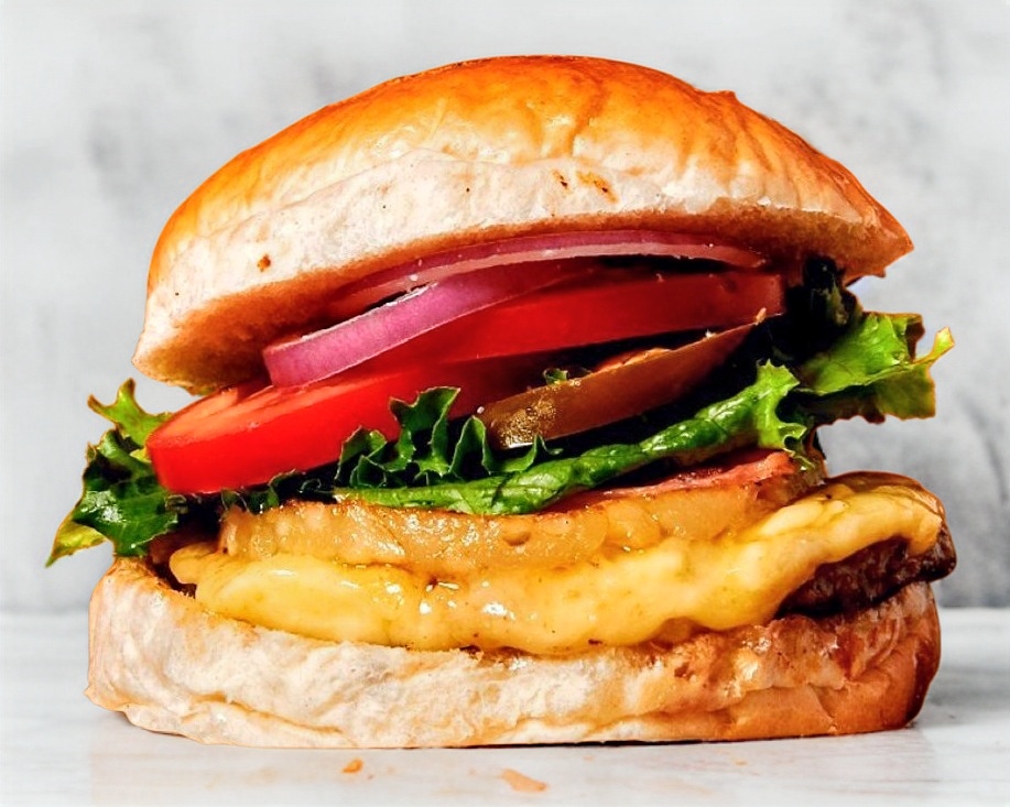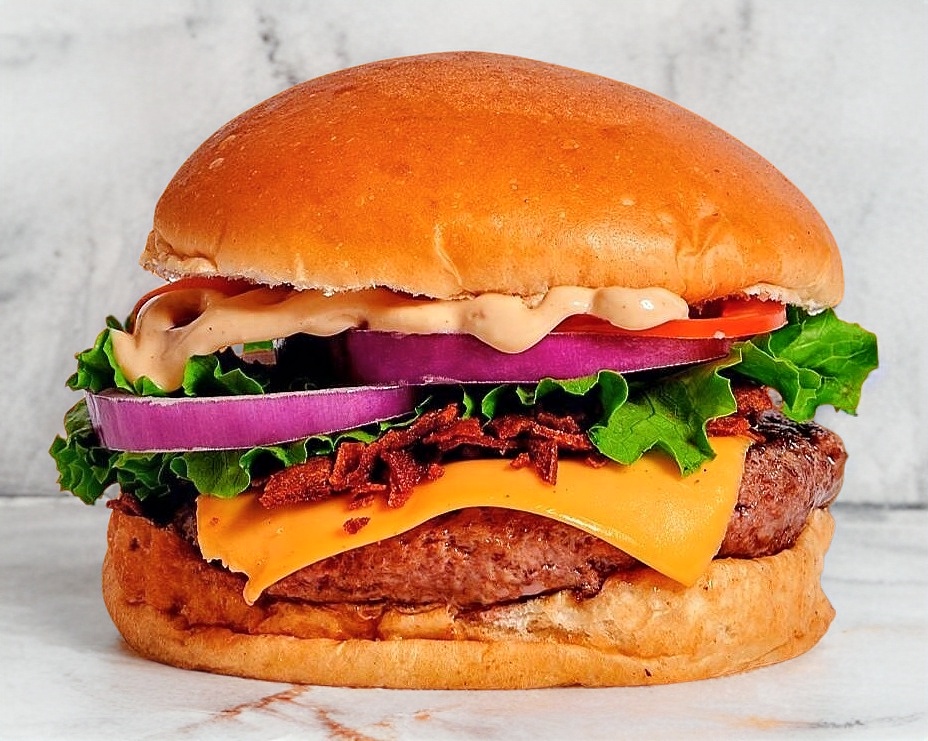 Carne de Res, queso americano y tocino con nuestro aderezo maestro especial con lechuga, tomate, cebolla y chile