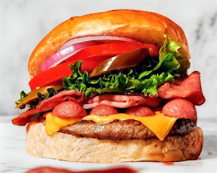 Carne de res, queso americano, salchicha, jamón y tocino con nuestro aderezo maestro especial con lechuga, tomate, cebolla y chile