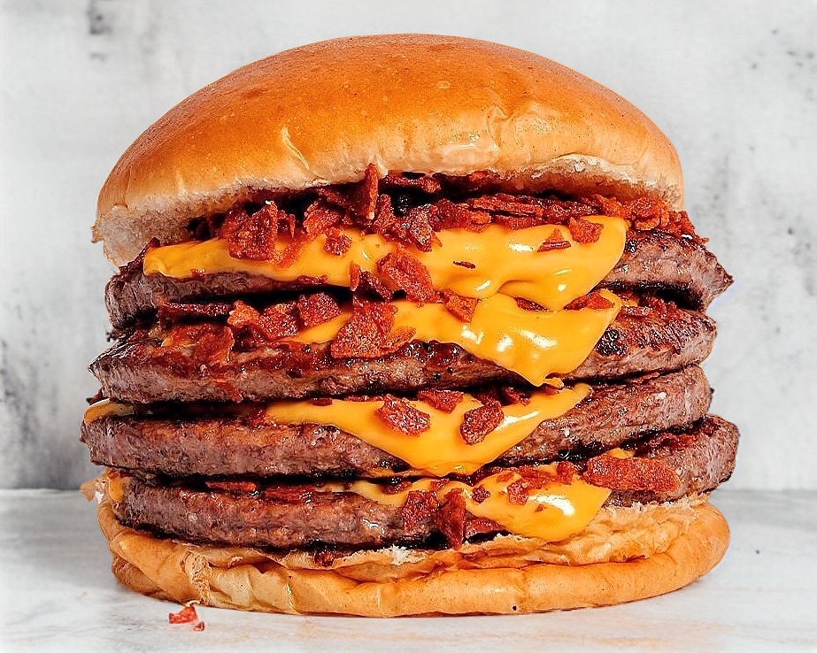4 Carnes de Res gratinadas con 4 rebanadas de queso americano y abundante tocino (sin verdura)