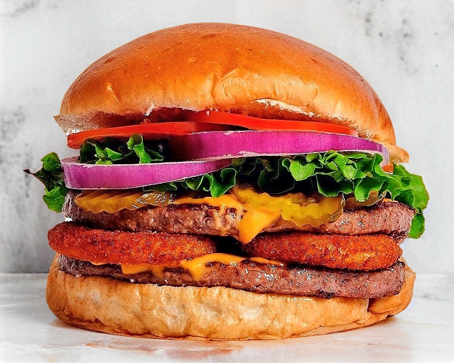 Doble Carne de Res, queso americano, 2 aros de cebolla, pepinillos y nuestro aderezo maestro especial con lechuga, tomate, cebolla y chile