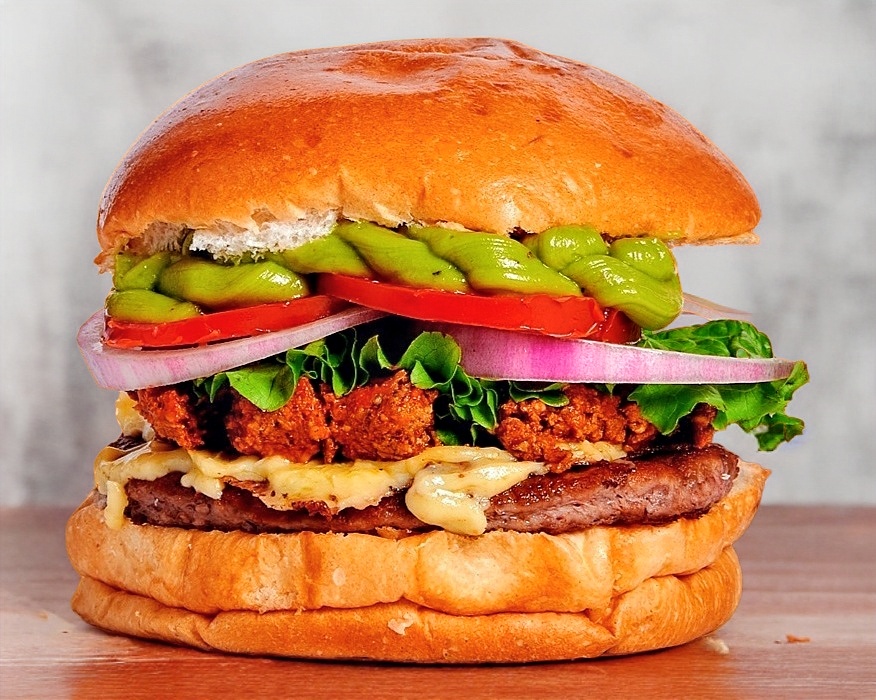 Carne de Res, queso americano y tocino con nuestro aderezo maestro especial con lechuga, tomate, cebolla y chile