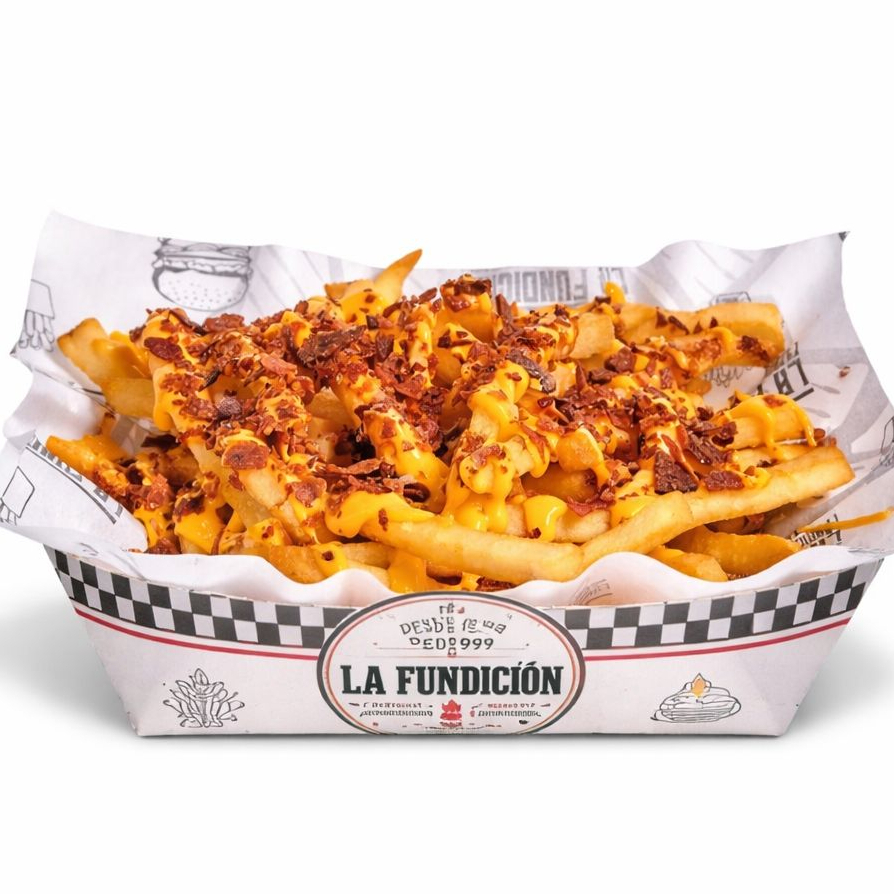 papas a la francesa cubiertas con queso cheddar y tocino