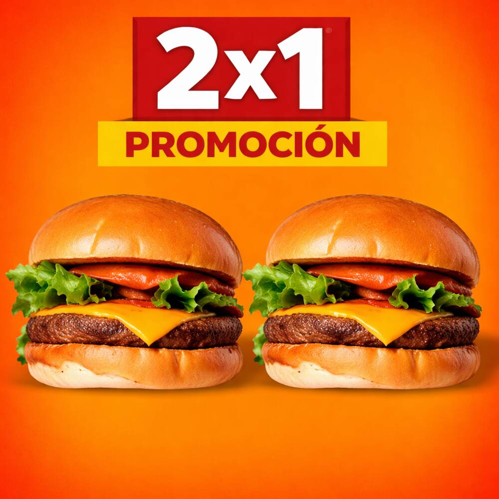 2 hamburguesas clasicas con queso y carne 100% de res, lechuga, tomate, cebolla, chile y aderezo especial en el pan