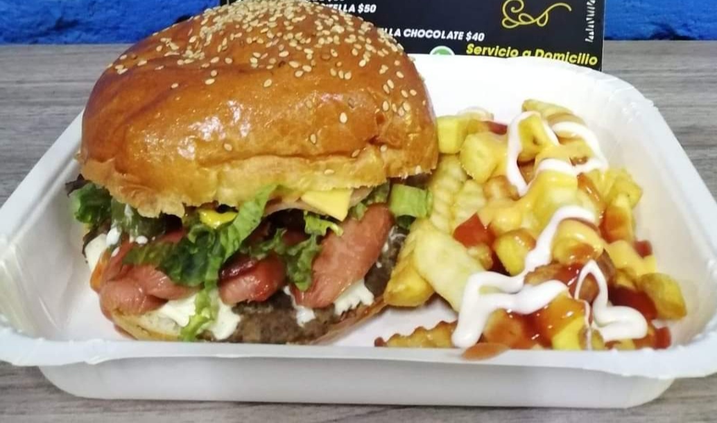 Carne de res jamón queso pollo boneles salsa BBQ mayonesa catsup lechuga cebolla pepinillos a compañada de papas