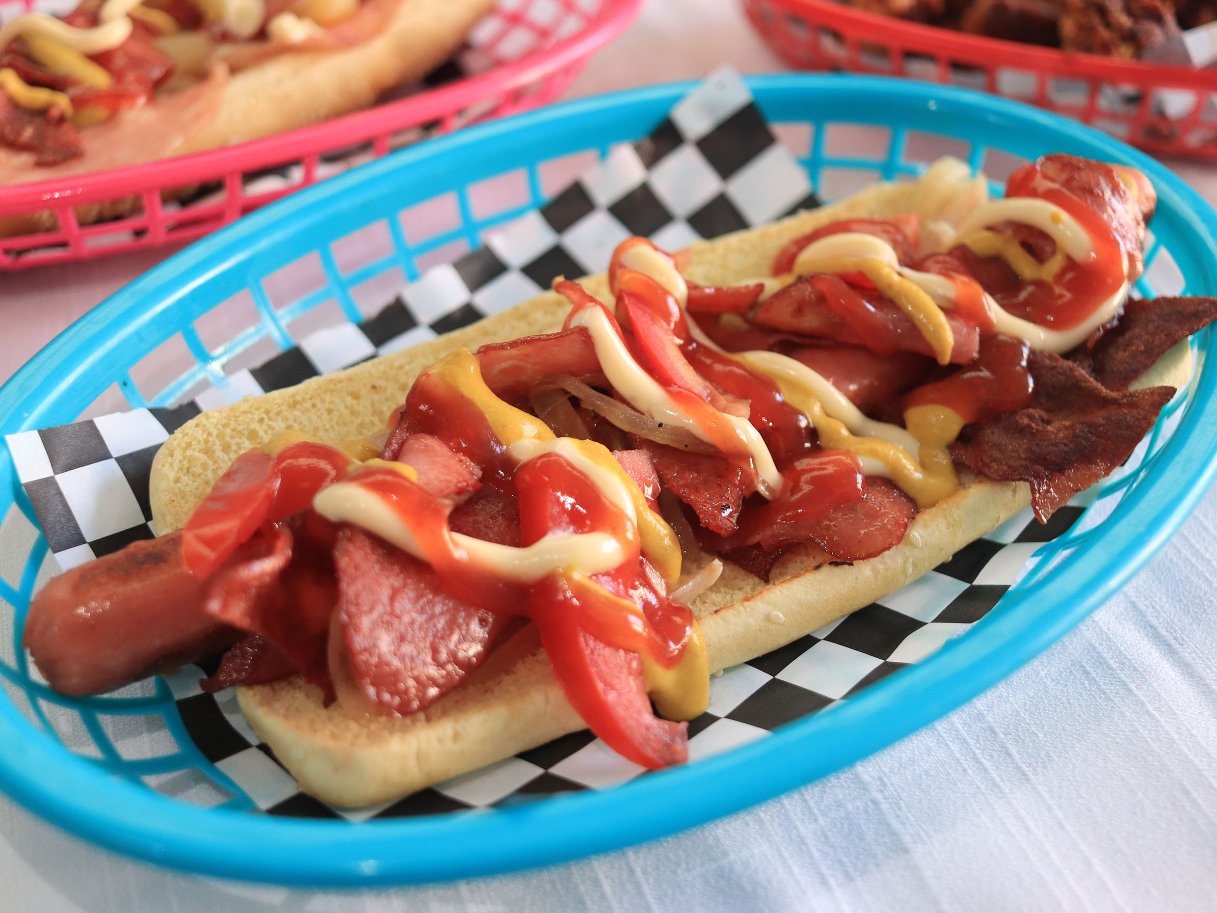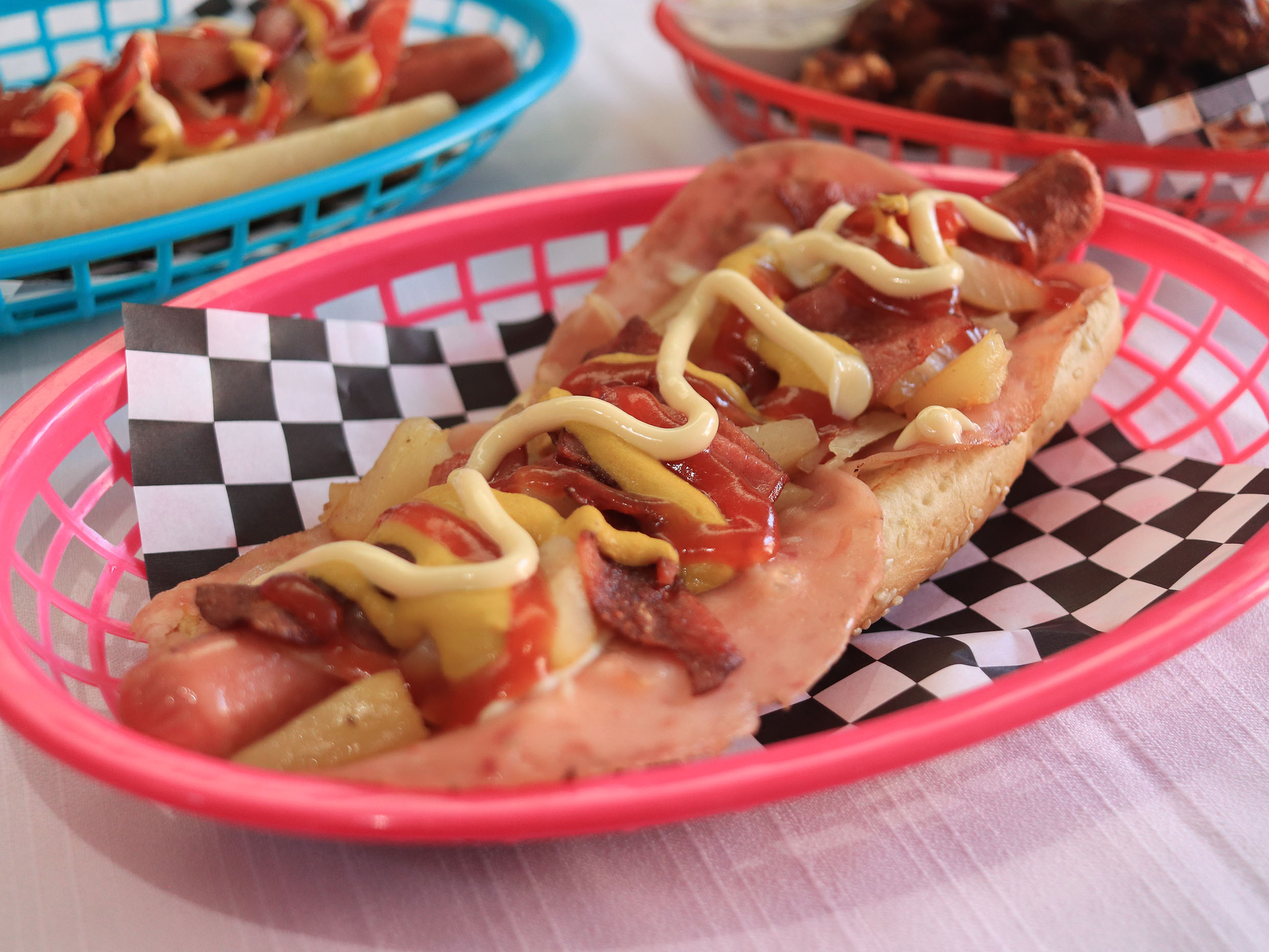 Salchicha de pavo tocino piña salsa BBQ tomate cebolla aderezos