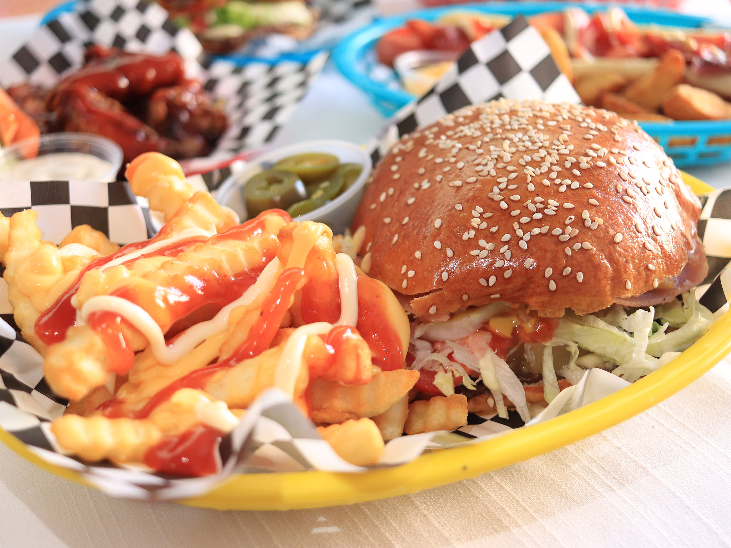 Carne de res dedos de queso salsa BBQ jamón queso manchego lechuga pepinillos mayonesa catsup acompañada de papas
