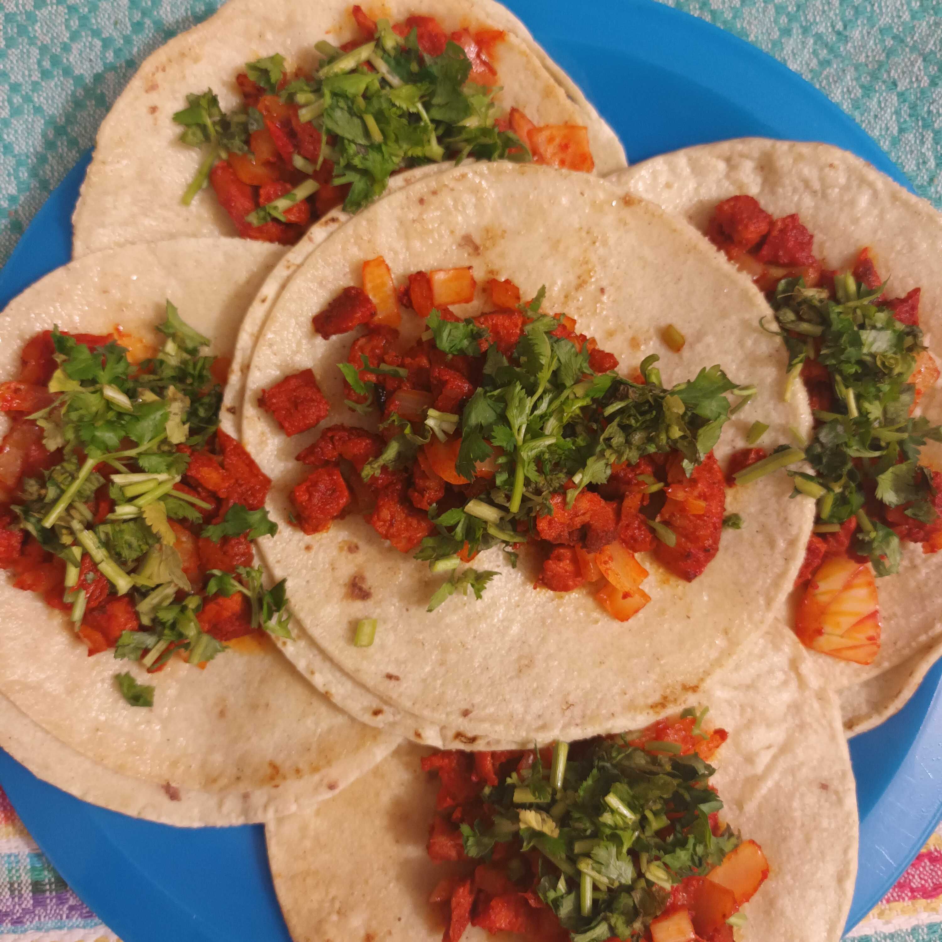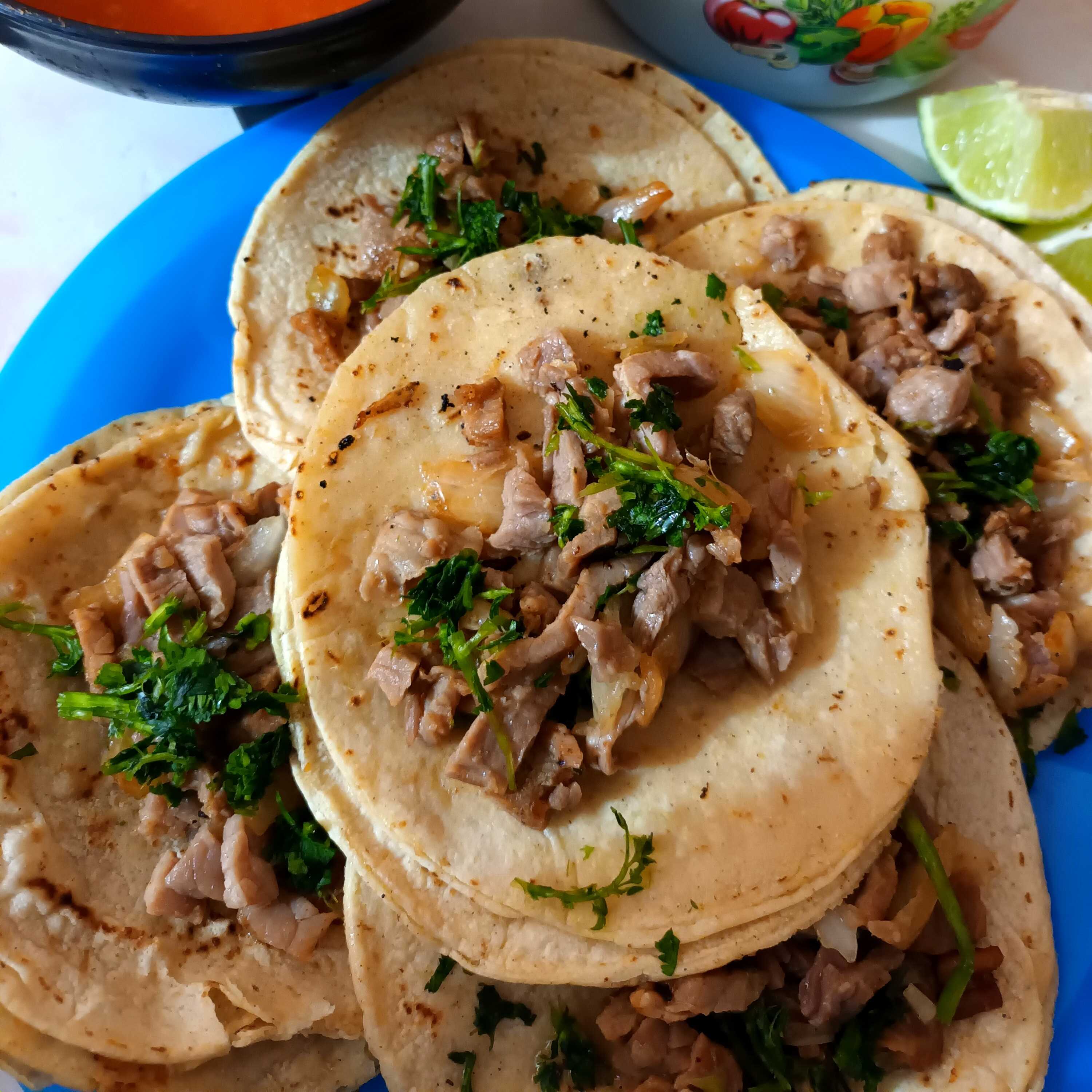 Orden de taquitos de cecina de doble tortilla acompañados de cebolla, cilantro, guacamole, salsa y limon