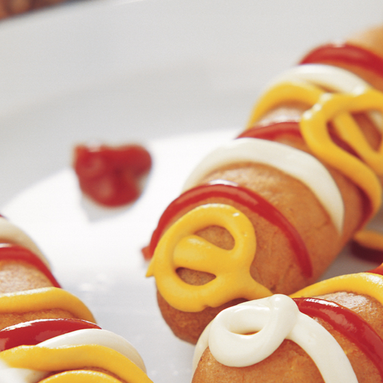 3 Ricas banderillas de salchicha, acompañadas de mayonesa, mostaza y mayonesa.