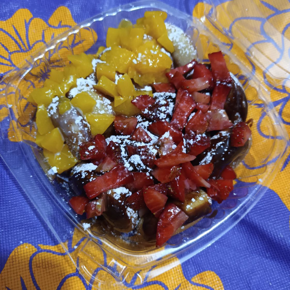 Orden de waffle de vainilla con fresa, plátano, chocolate y dulzura.