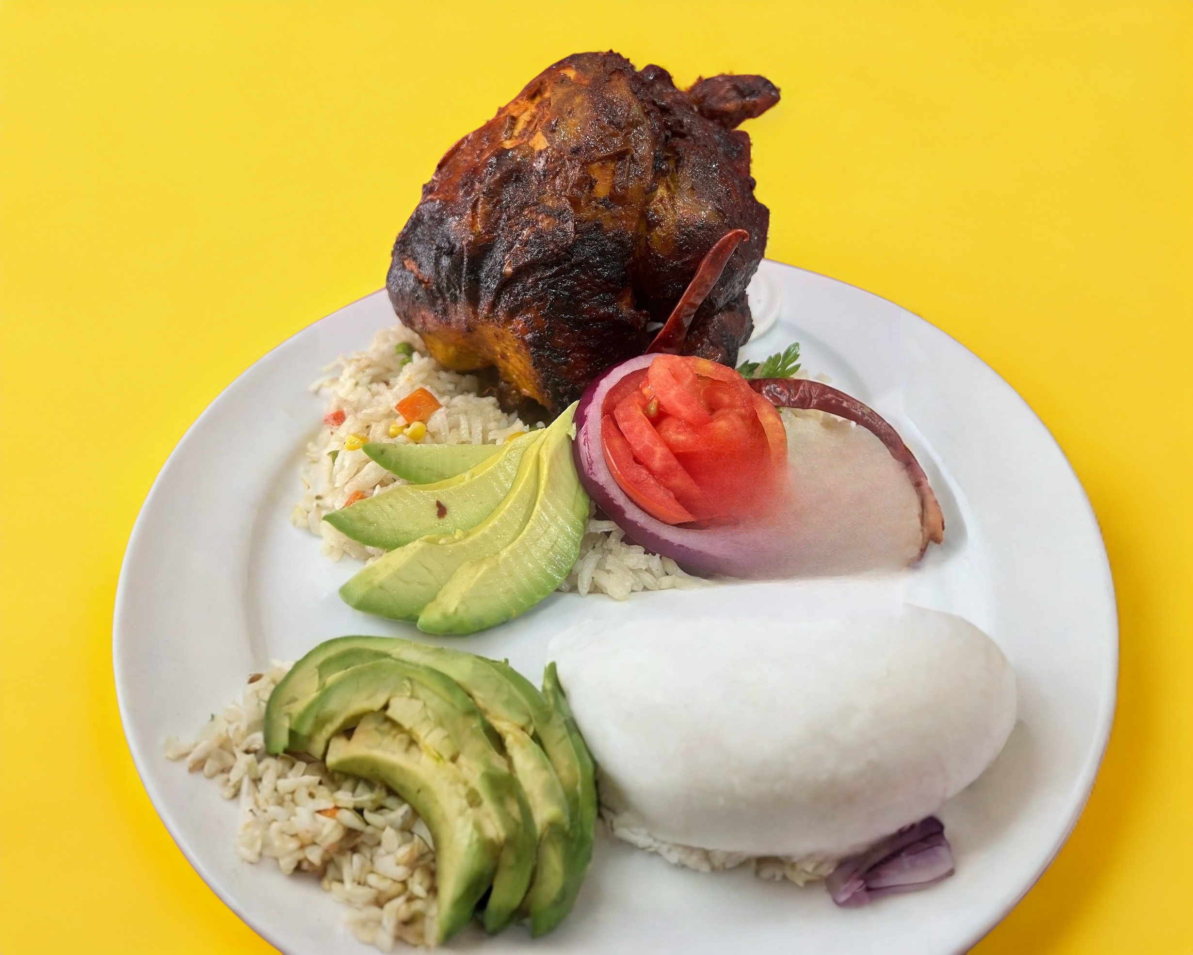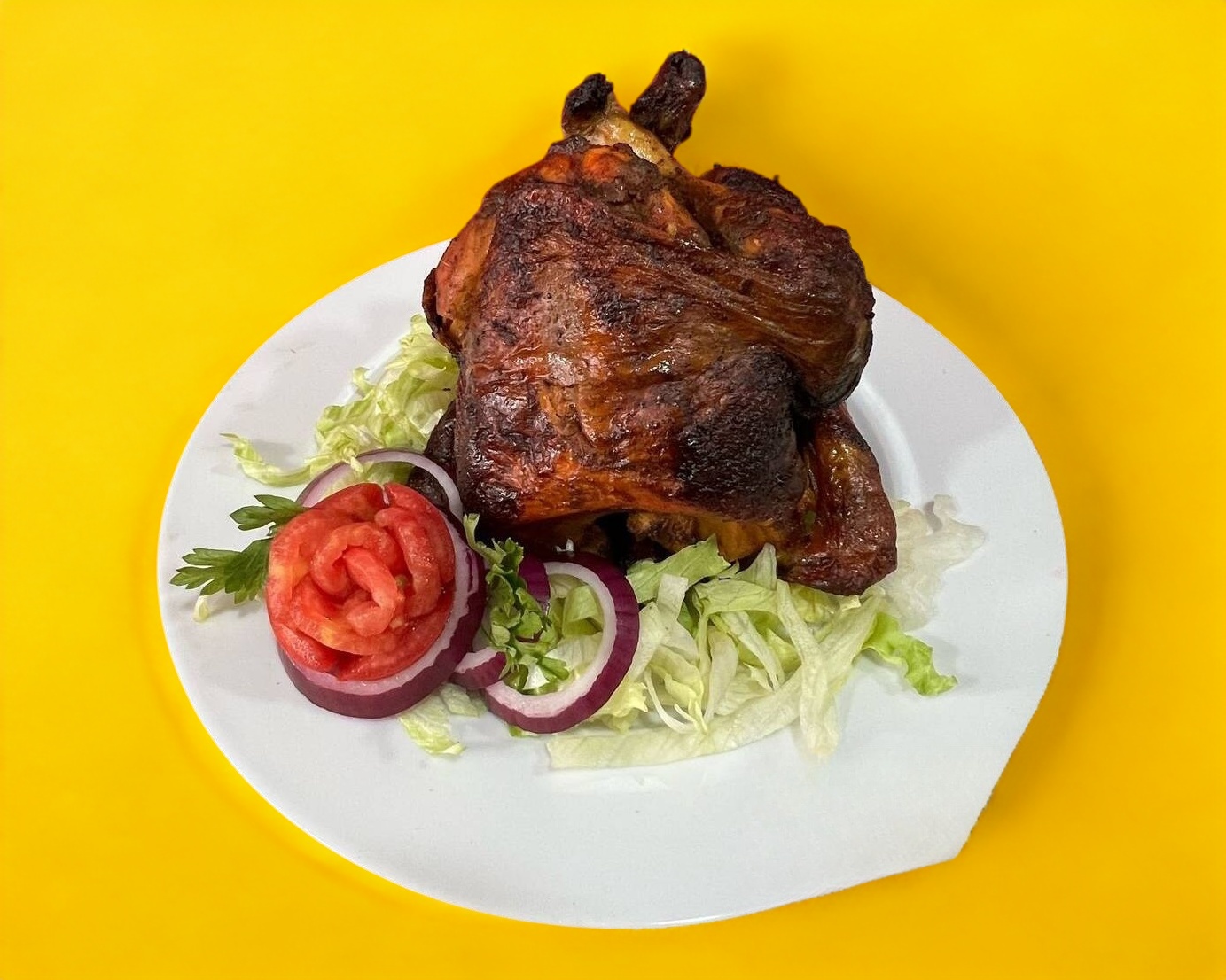 Pollo entero marinado al estilo pastor, con mezcla de chiles y especias. Sabor intenso y delicioso, sin ser muy picante. Pollo entero. Sin guarniciones.