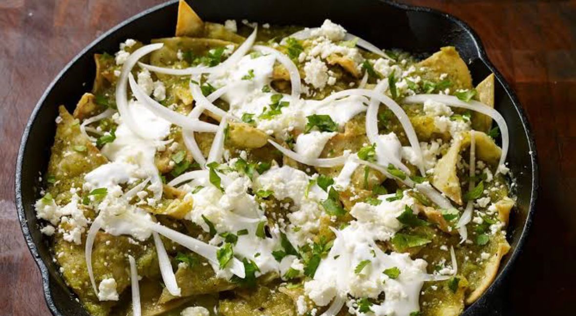 100 g De totopo con salsa verde con chile morita. Cebolla, queso, perejil y crema.