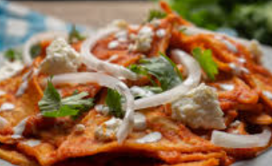 100 g De totopo con salsa roja, cebolla, queso, perejil y crema.