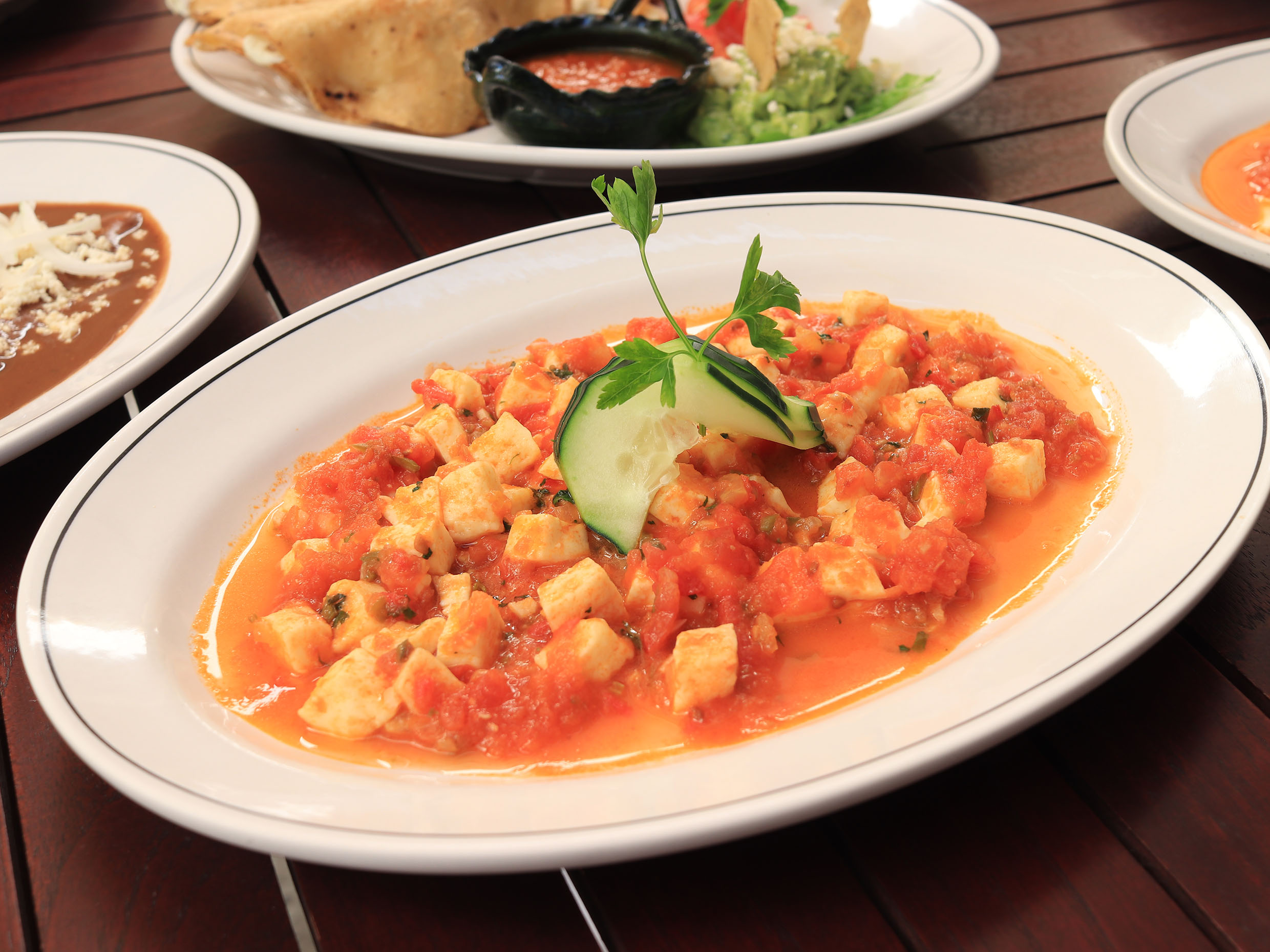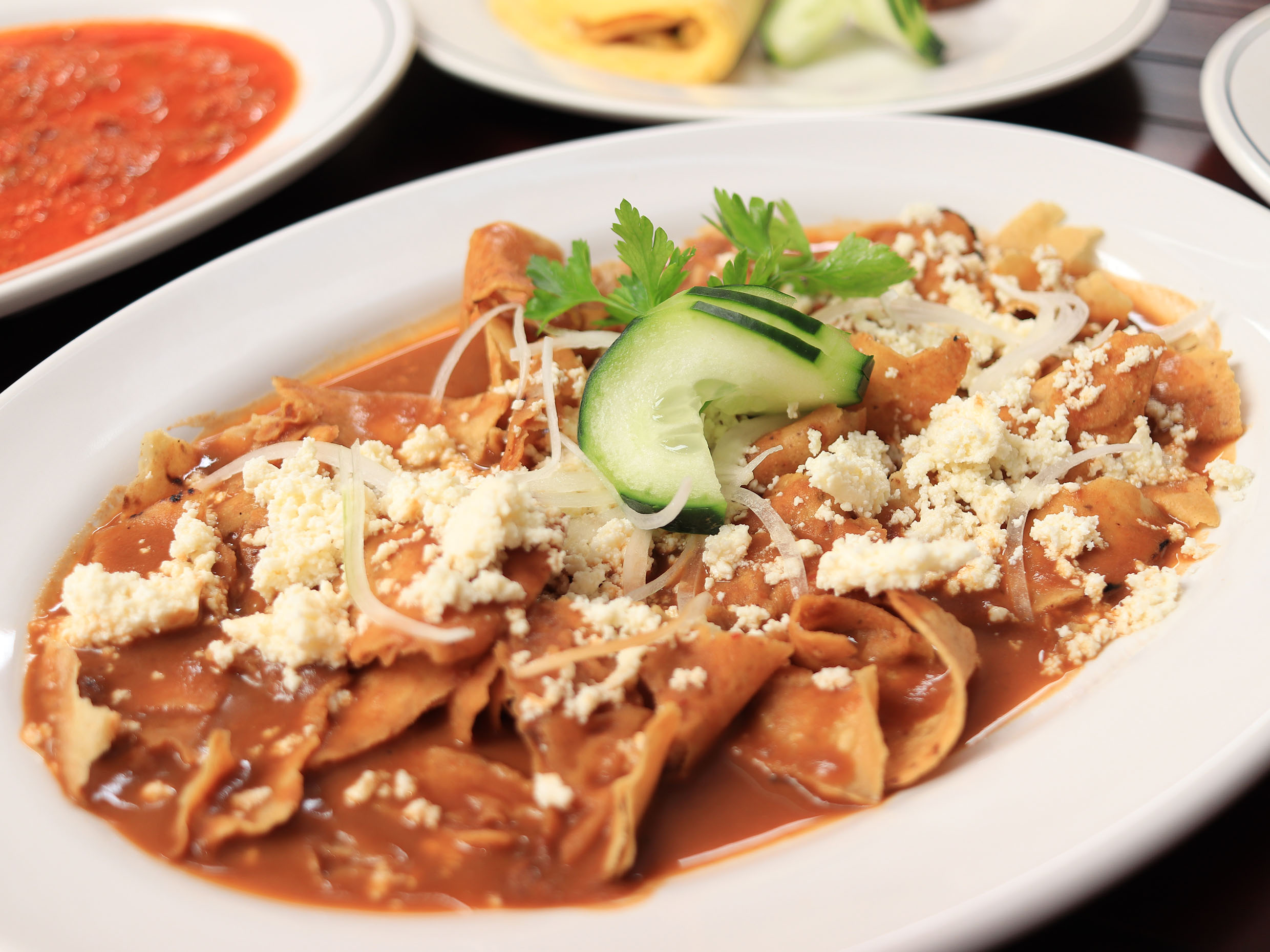 Totopos bañados en salsa roja, verde o de frijol (con o sin picante) sin carne.