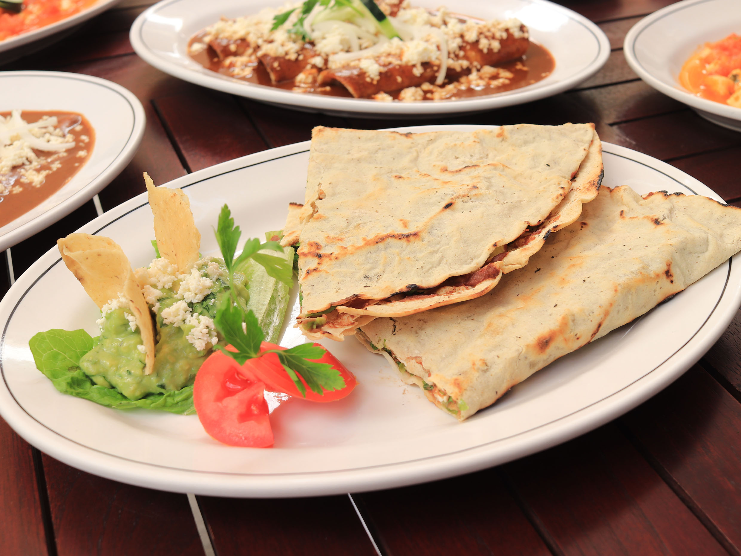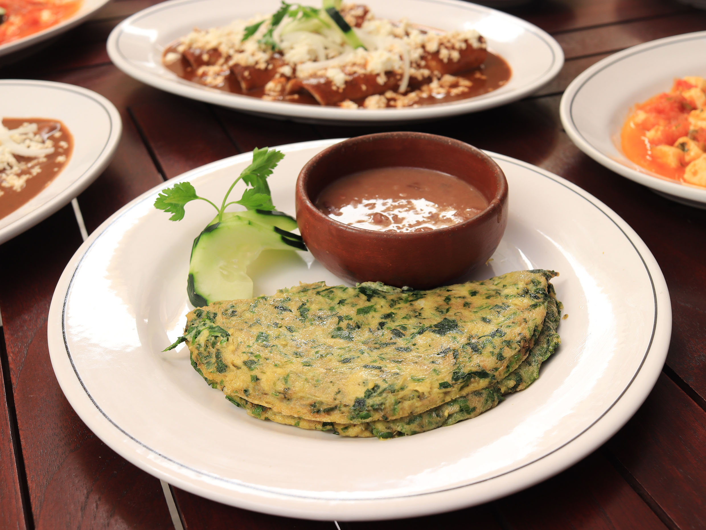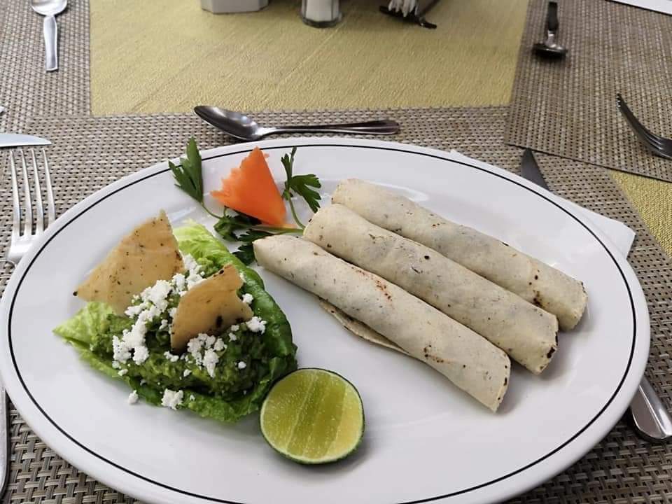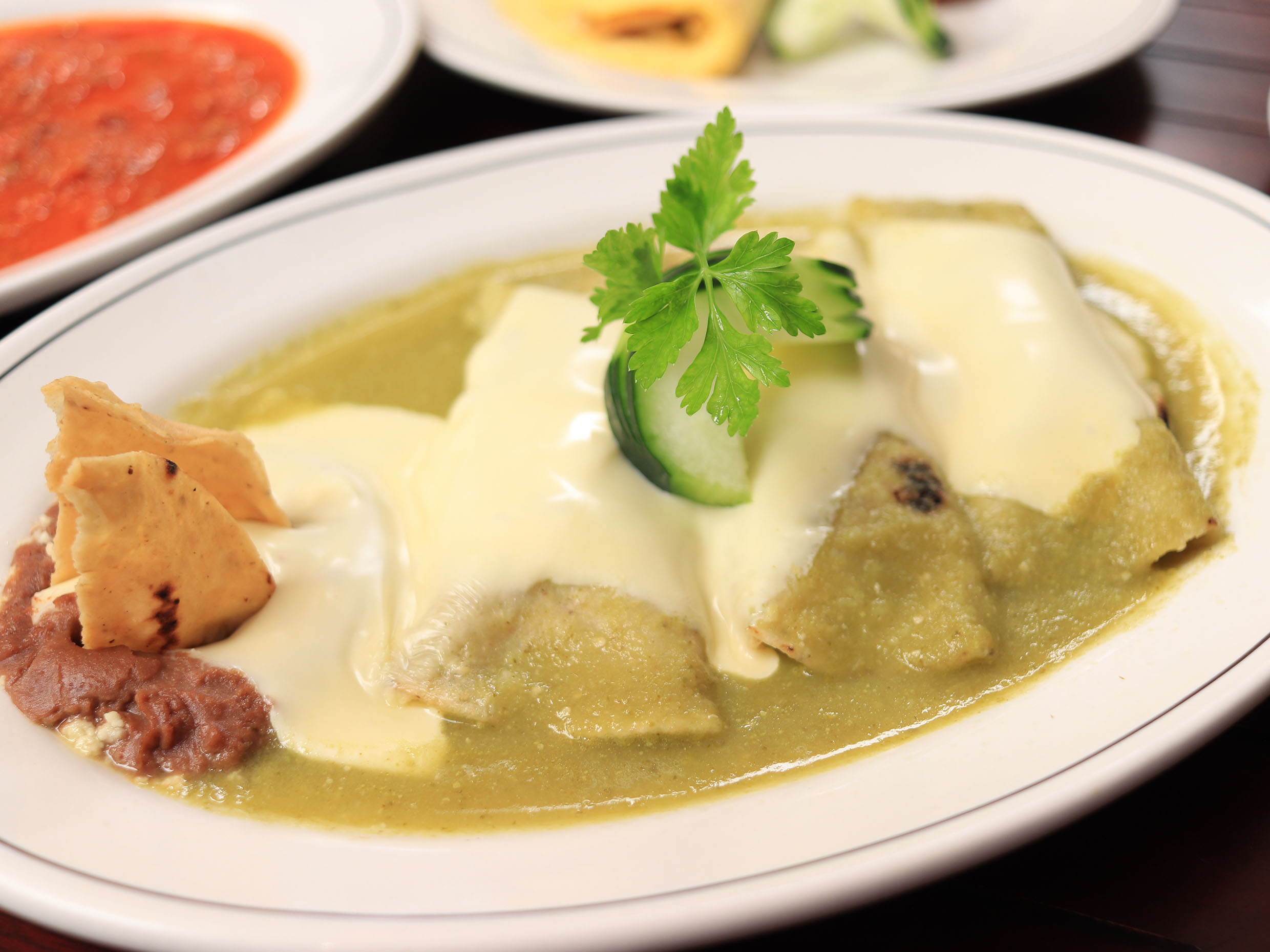 Tortillas rellenas de pollo, bañadas de salsa verde, cubierta de queso manchego y acompañadas de frijol en pasta.