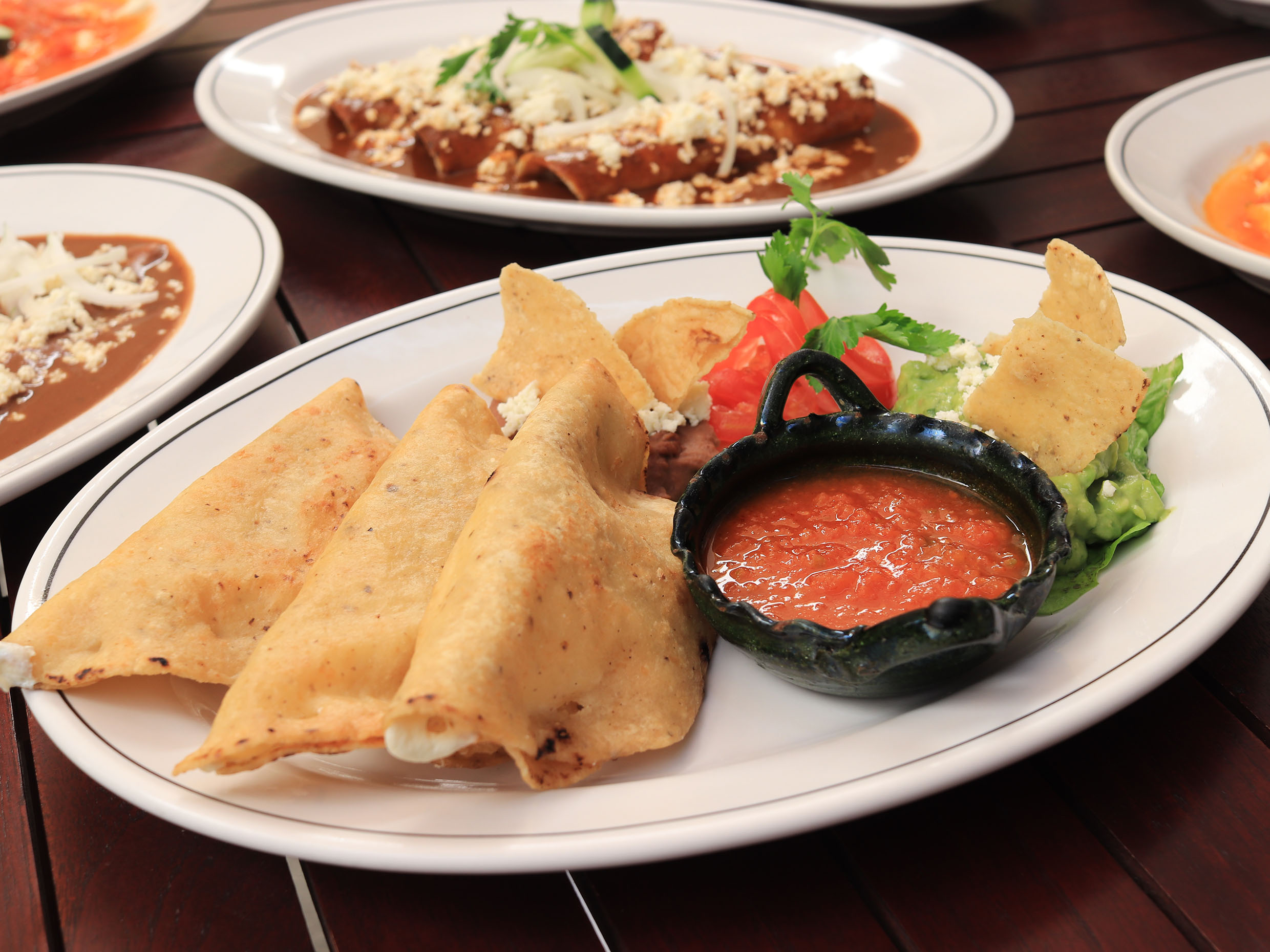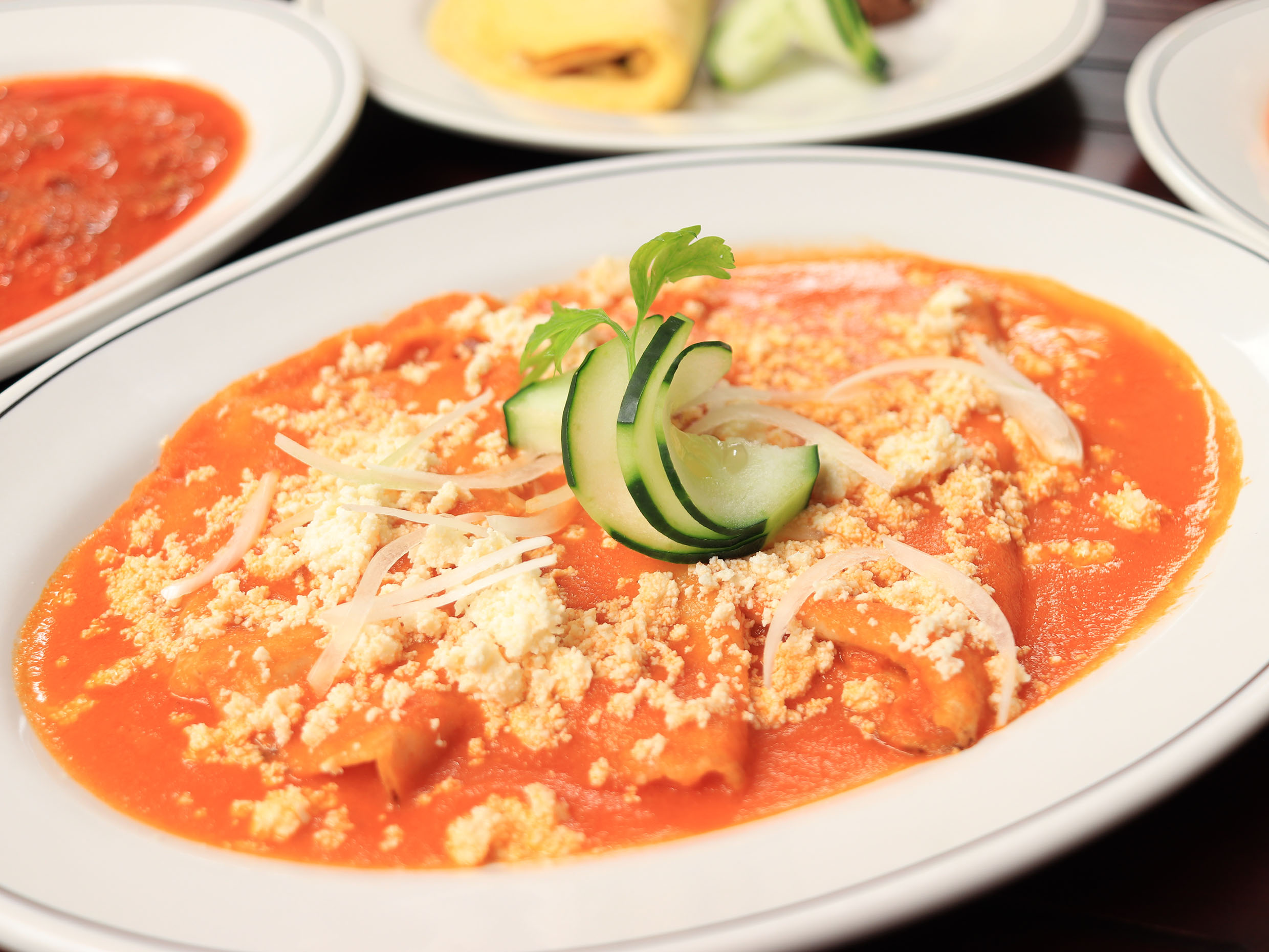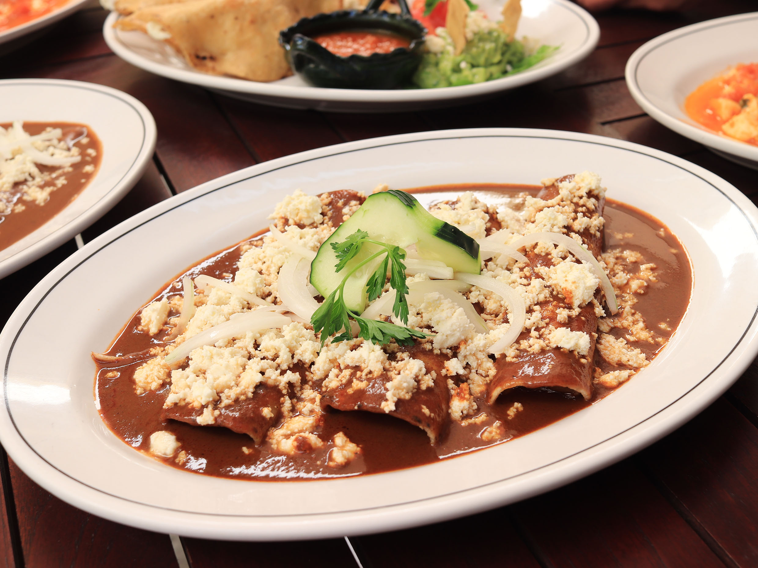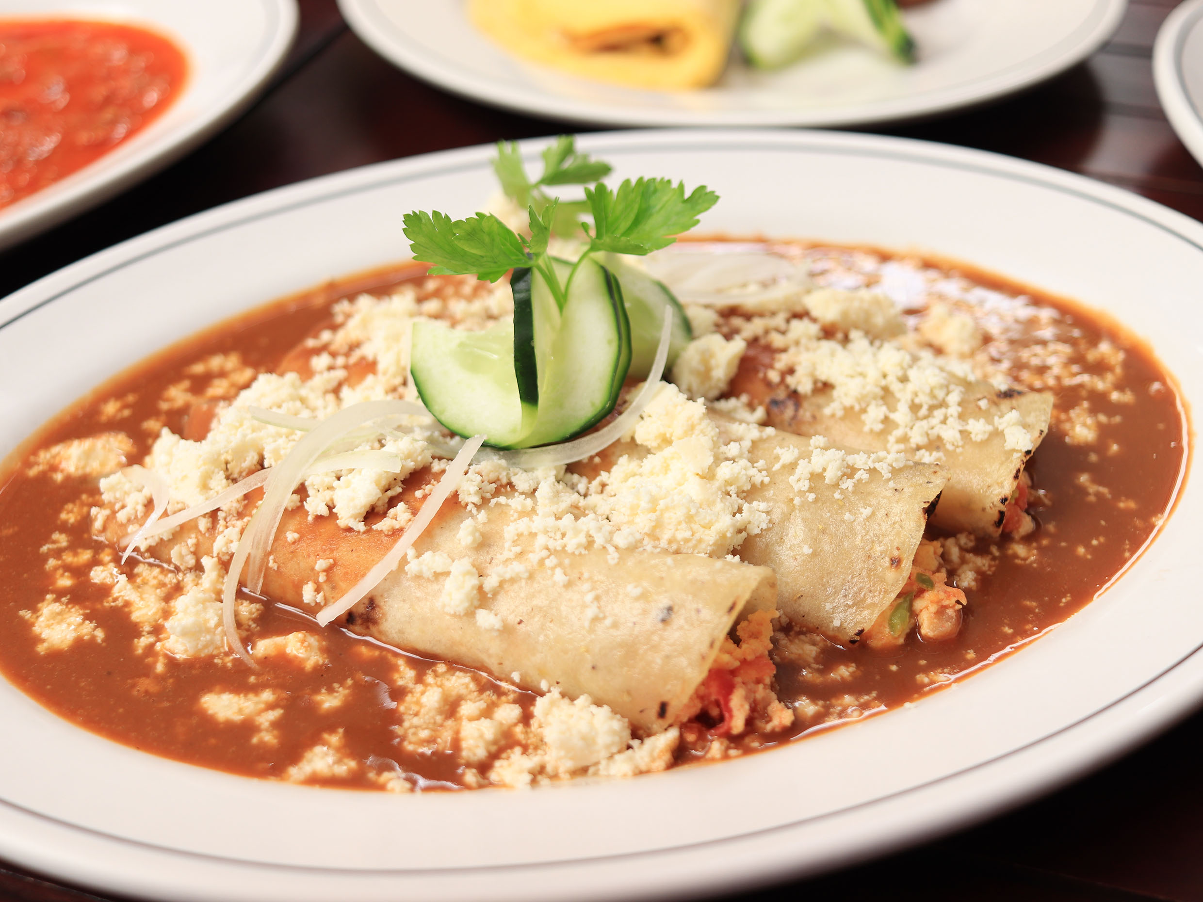 Tortillas rellenas de pollo y bañadas de coloradito.