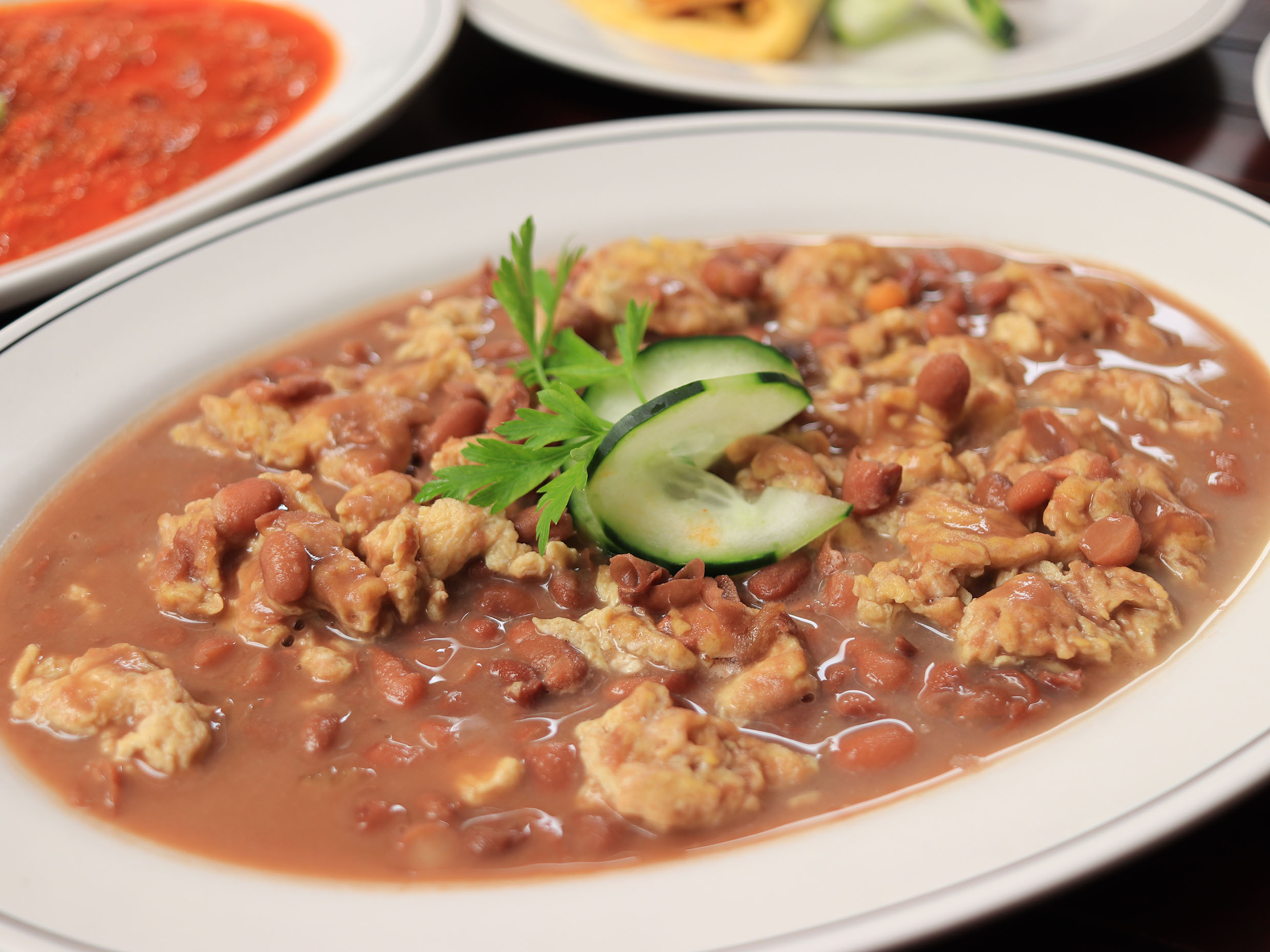 Huevos revueltos bañados en mole acompañados de frijoles.