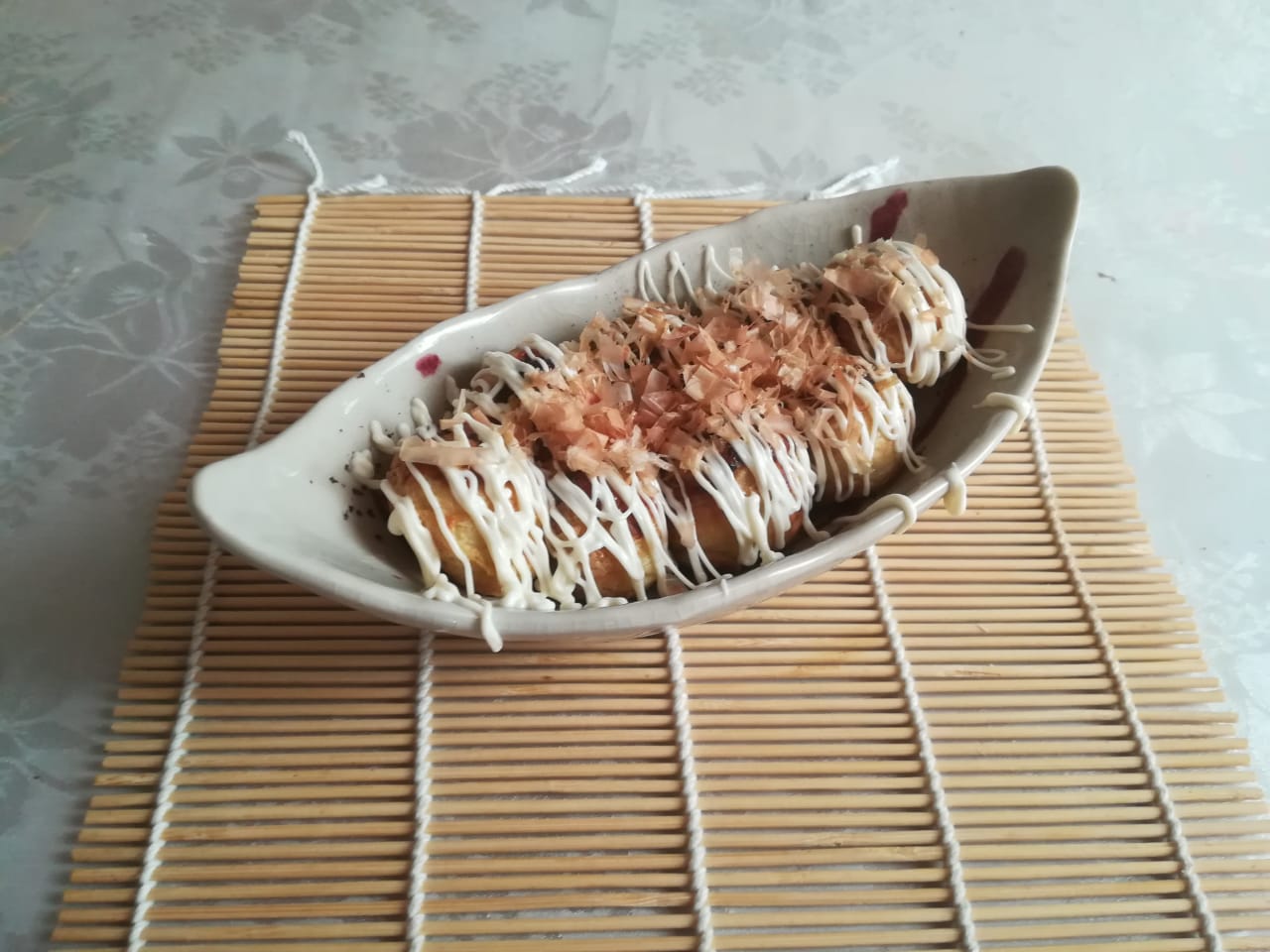 Bolitas de pulpo empanizadas servidas con salsa otafuku, polvo de alga nori, mayonesa japonesa y hojuelas de pescado bonito seco.