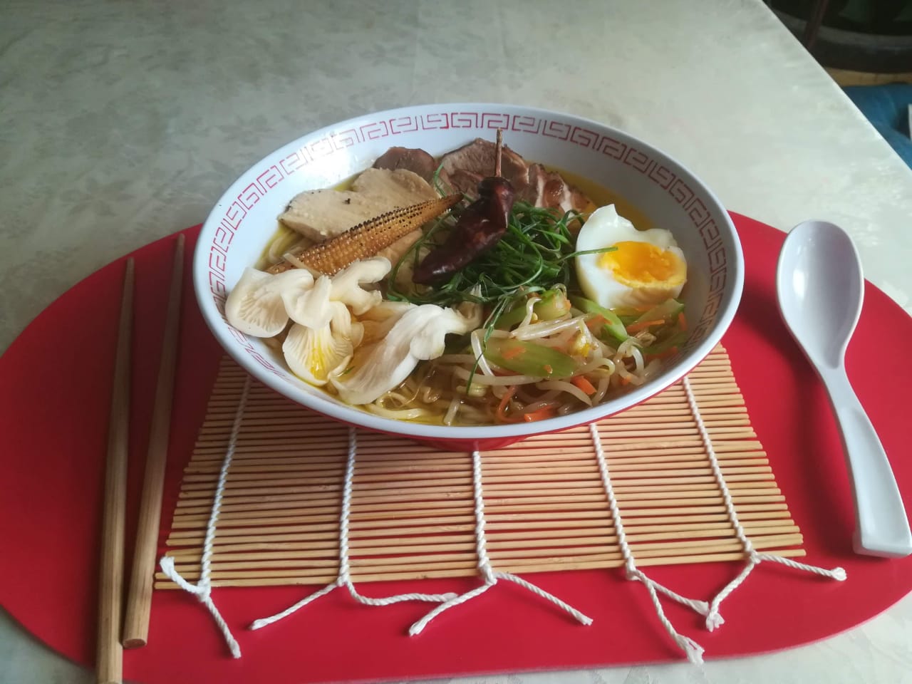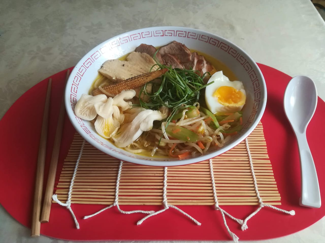 Sopa ramen sazonada con pasta de curry coreano, carne de cerdo chashu, huevo, hongos, mix vegetales, granos de elote, cebollín y ajonjolí.