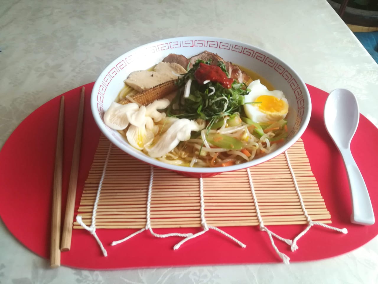 Sopa ramen acompañada con una porción de kimchi coreano, carne de cerdo chashu, huevo, hongos, mix vegetales, granos de elote, cebollín y ajonjolí.