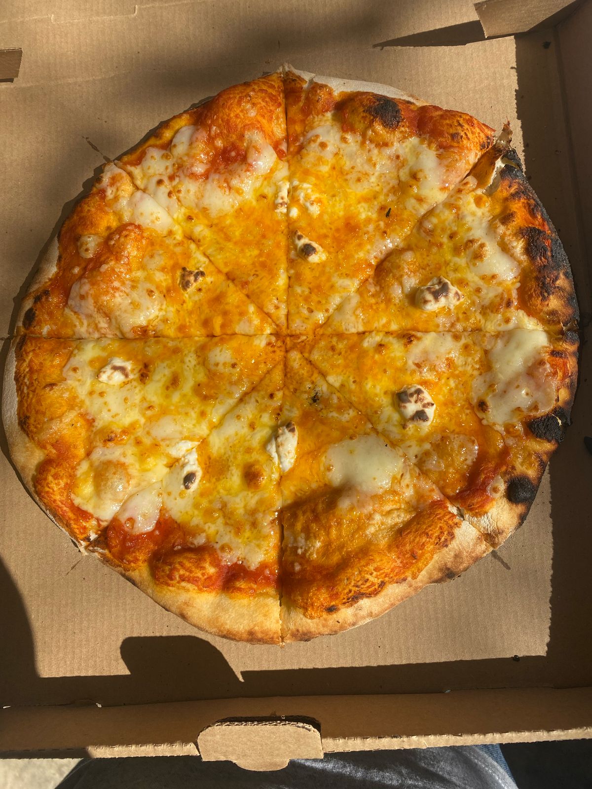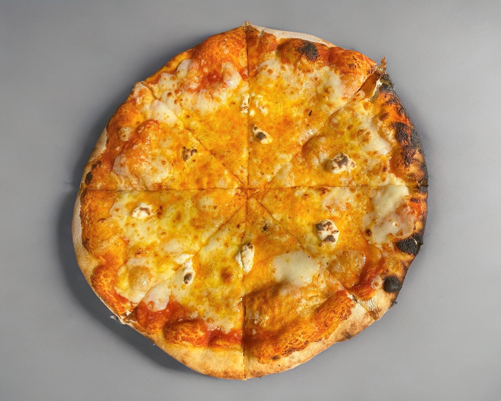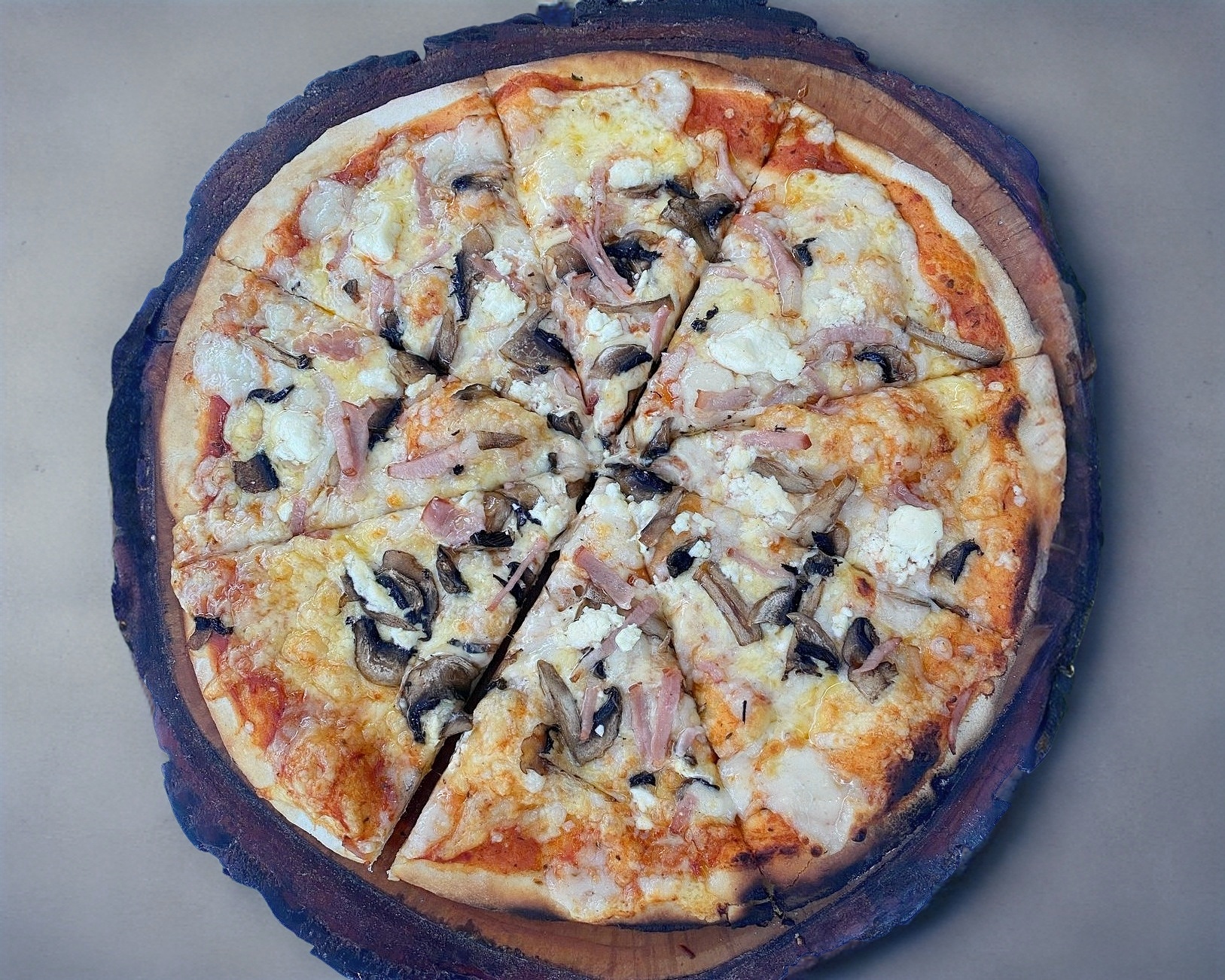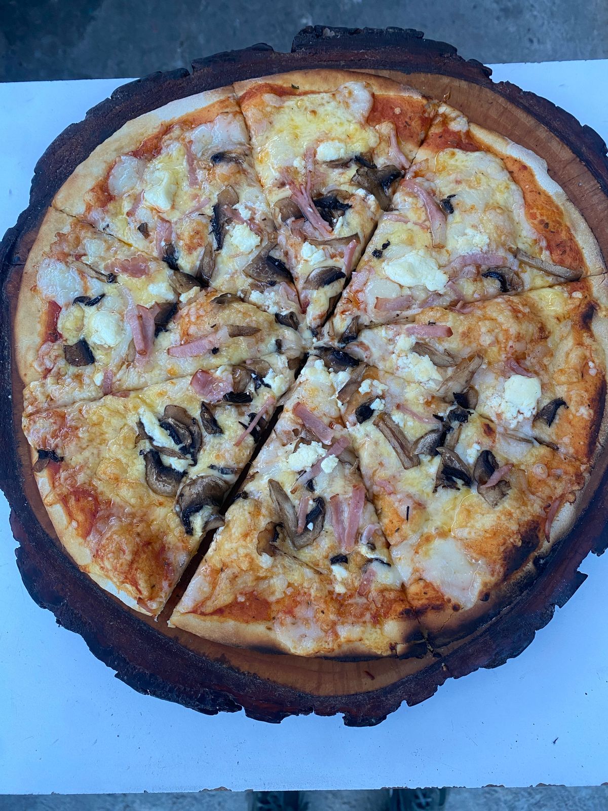 Salsa de tomate, queso mozzarella, champiñones, tocino y queso de cabra.