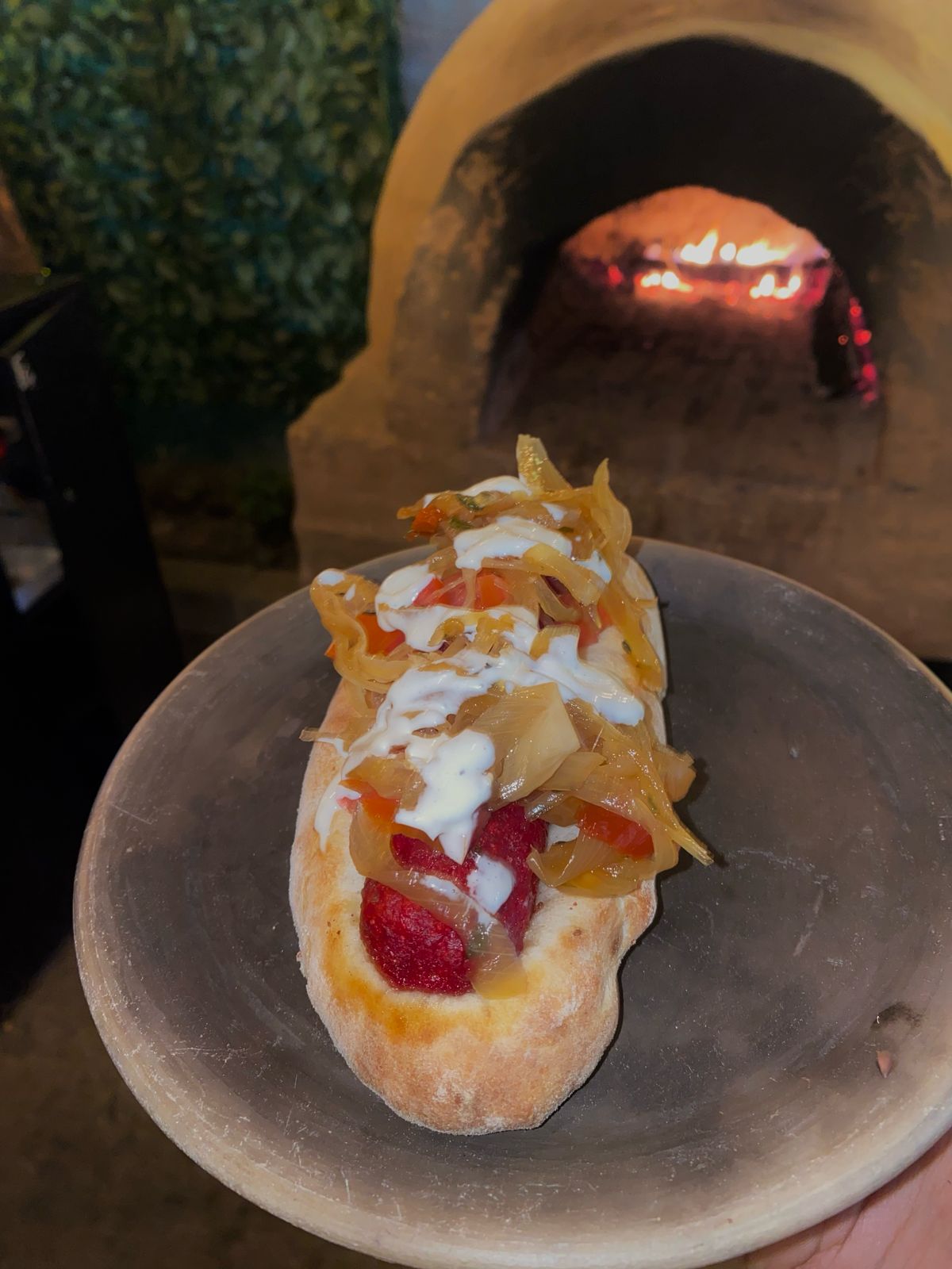 hot dog hecho con salchicha asadera y pan a base de masa de pizza acompañado con cebollas caramelizadas, tomate y aderezo ranch.