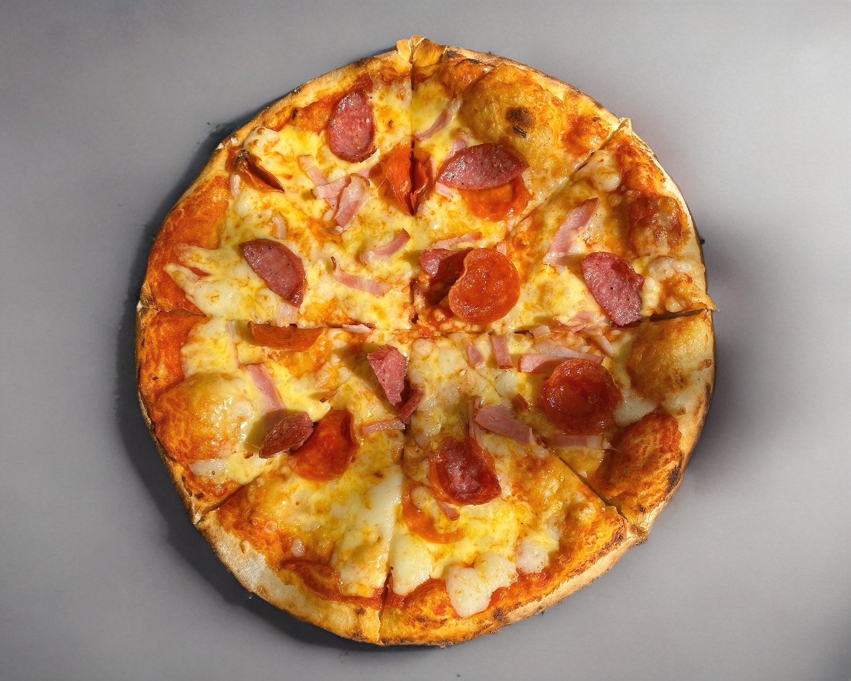 Salsa de tomate, queso mozzarella, salami, tocino y pepperoni.