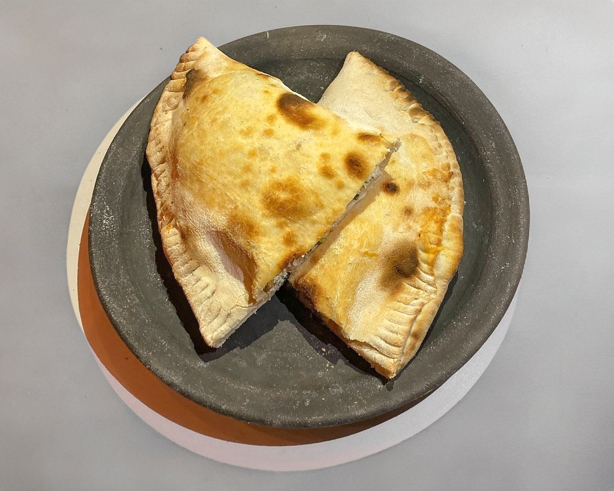 150 gramos de masa con relleno de champiñones salteados, espinaca, cebolla morada, queso mozzarella y relish