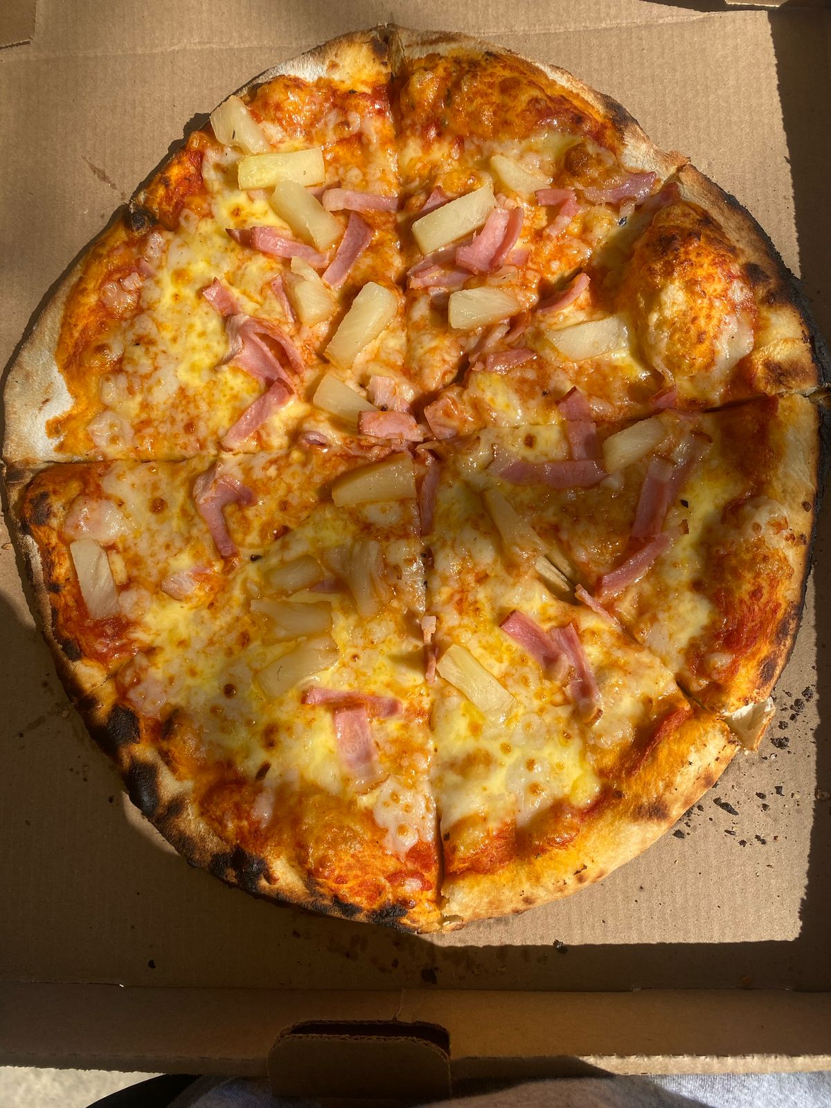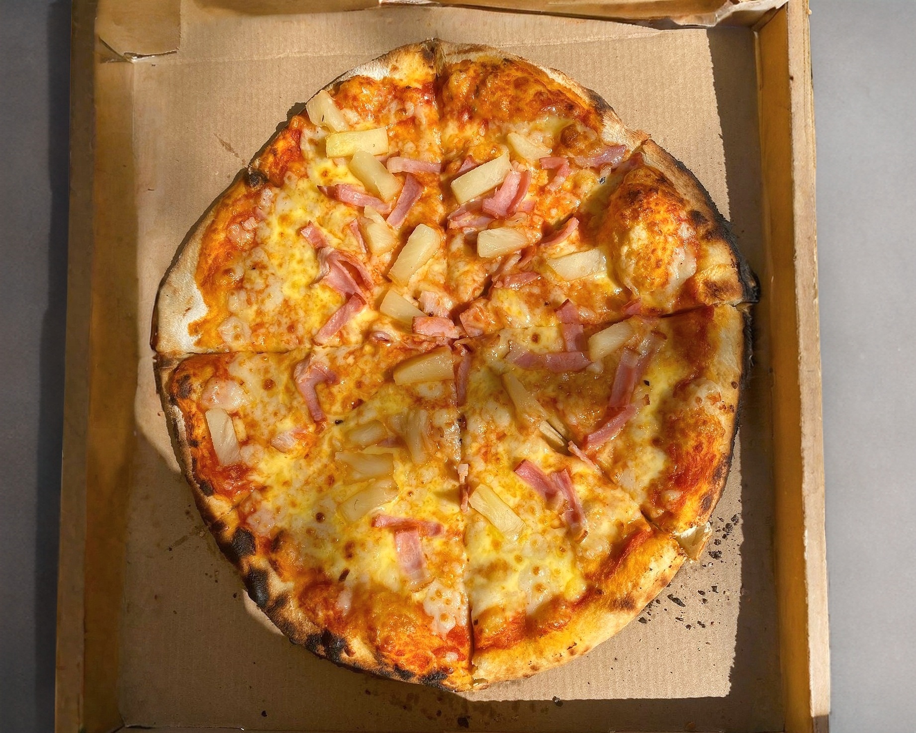 Salsa de tomate, queso mozzarella, tocino y piña.