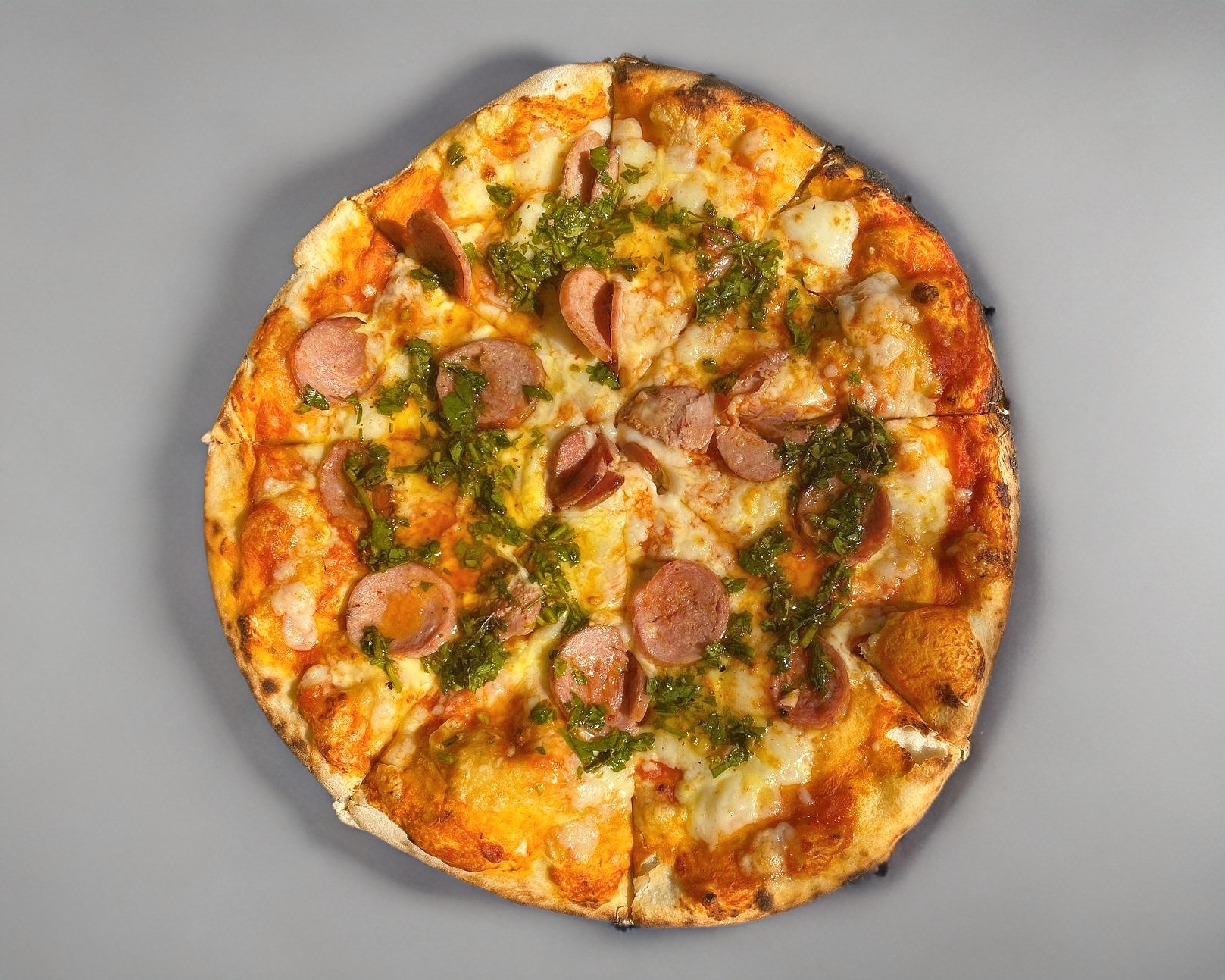 Salsa de tomate, queso mozzarella, chorizo argentino y chimichurri.