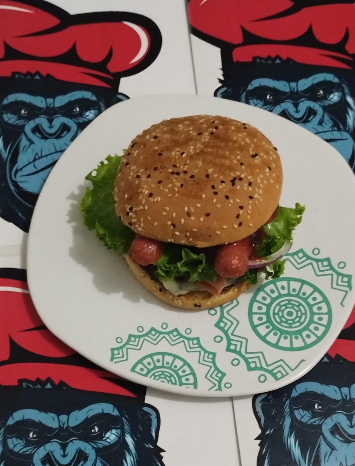 Pan artesanal, aderezo picosito de la casa, 150 g de carne de res, jamón de pavo, queso americano, lechuga italiana, cebolla morada, tomate, chiles jalapeños y cátsup.