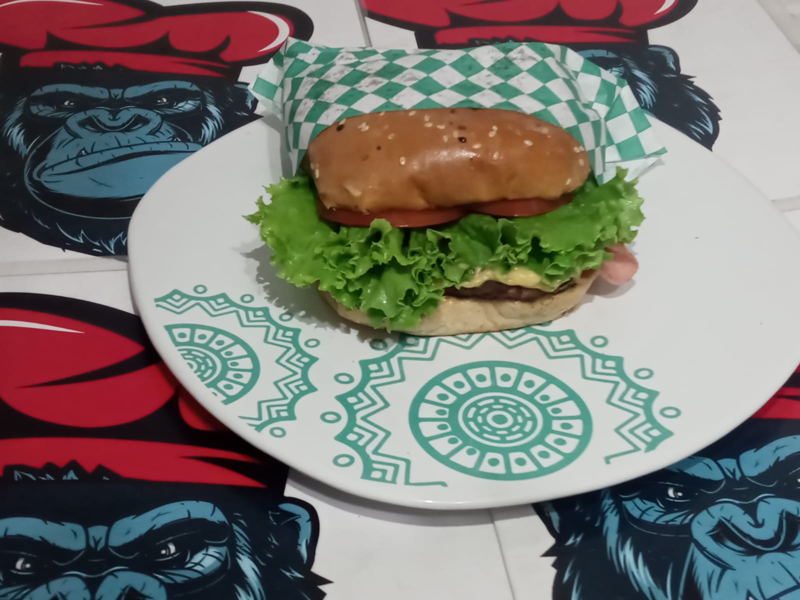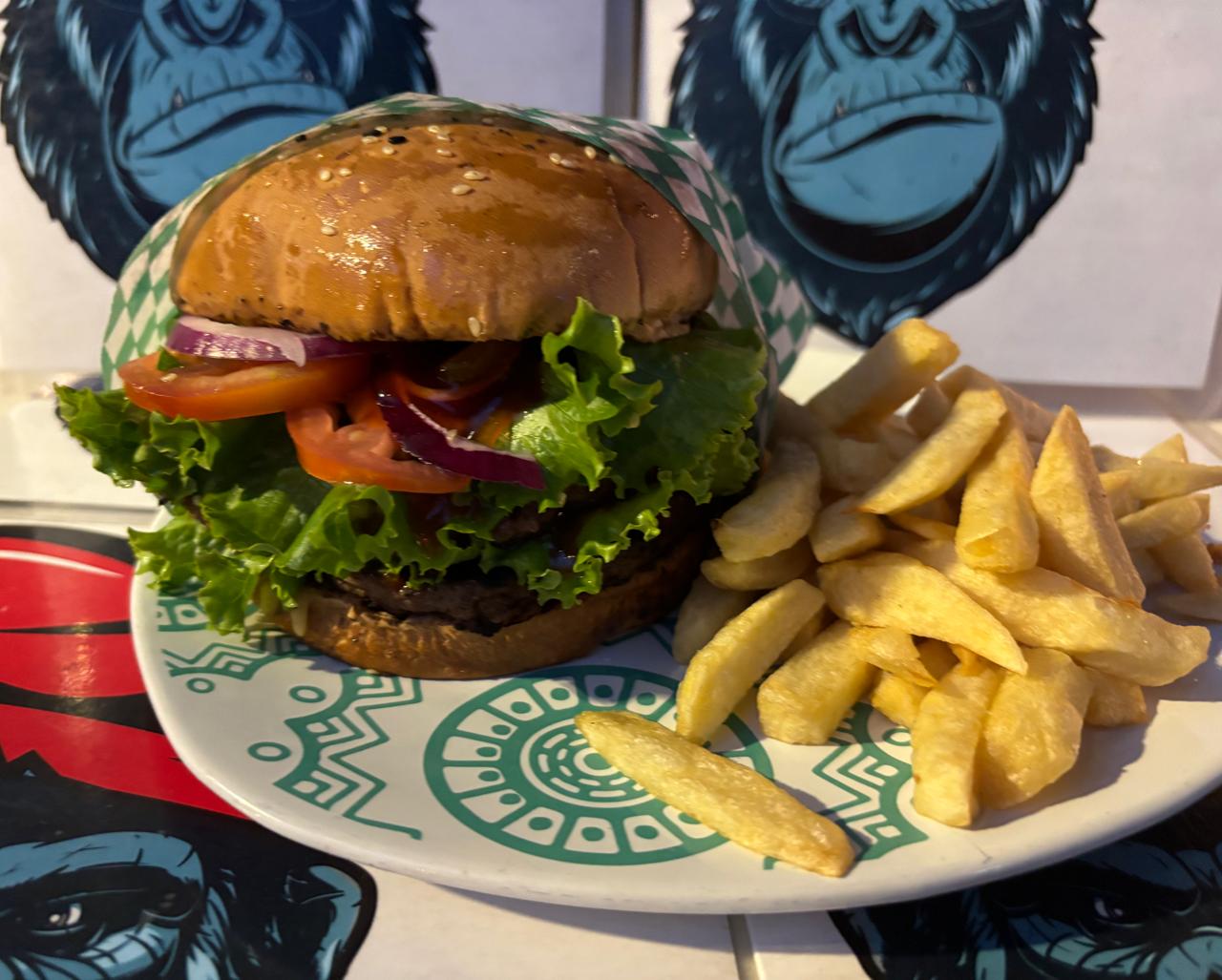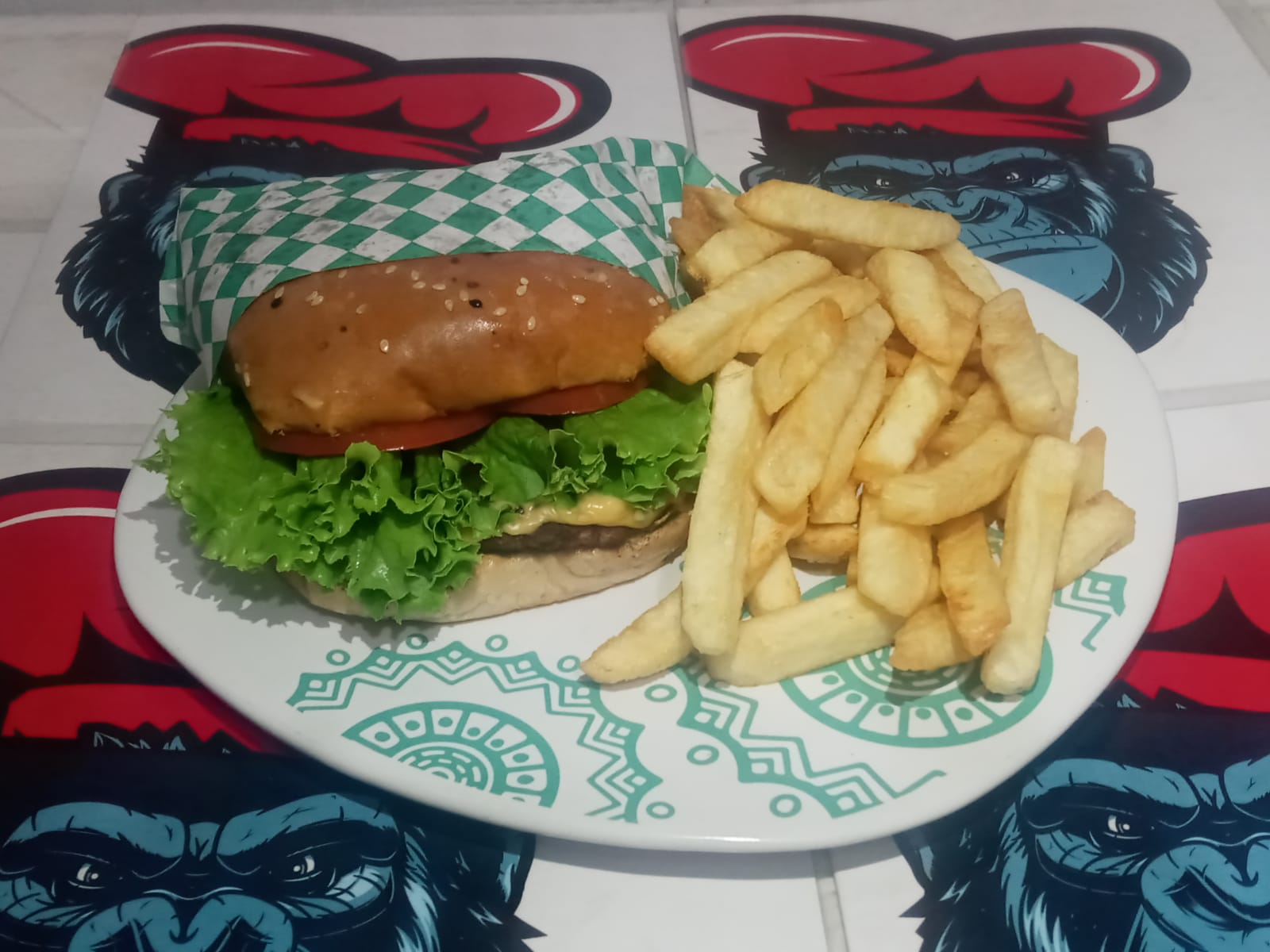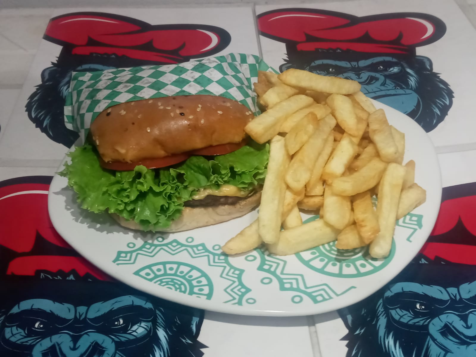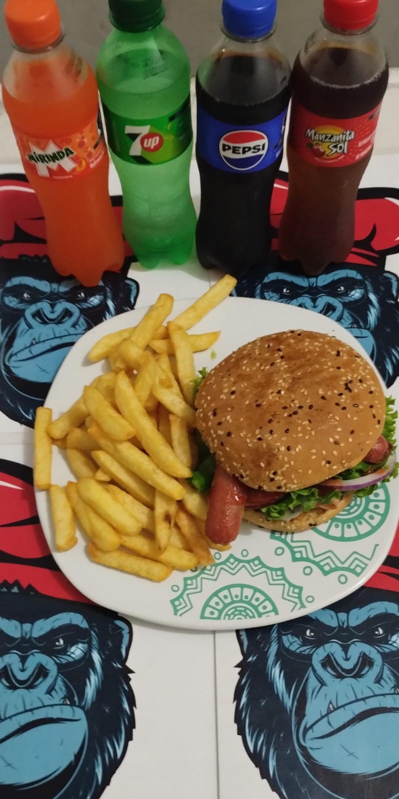 Hamburguesa doble carne acompañada de una guarnición a elegir y un refresco a elegir.