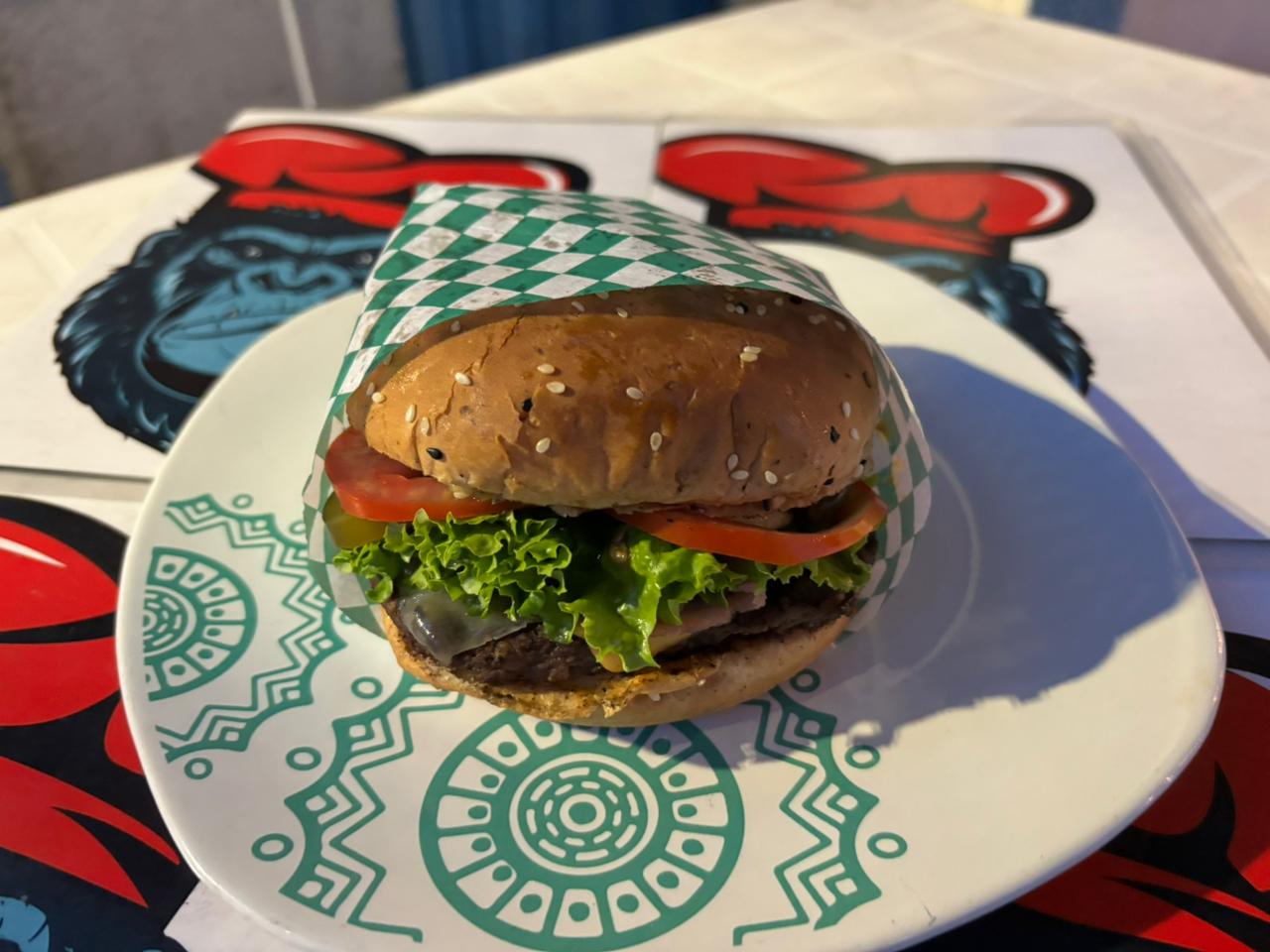 Pan artesanal, aderezo picosito de la casa, 150 g de carne de res, jamón de pavo, queso americano, lechuga italiana, cebolla morada, tomate, chiles jalapeños, piña y cátsup.