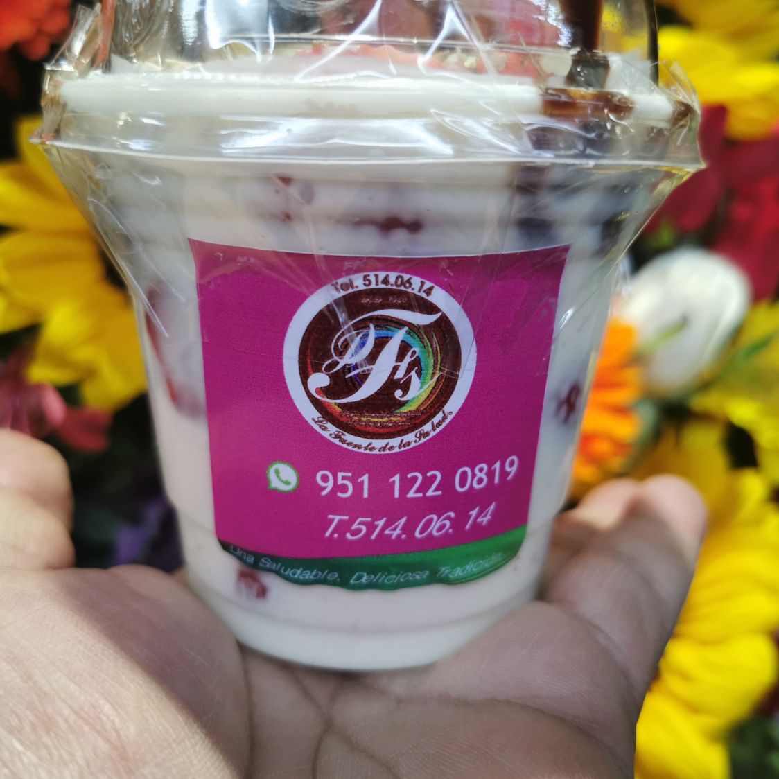 Delicioso yogurt de sabor guayaba con nuez, papaya, melón, sandia, manzana, plátano, ralladura de jícama granola y un trocito de gelatina.