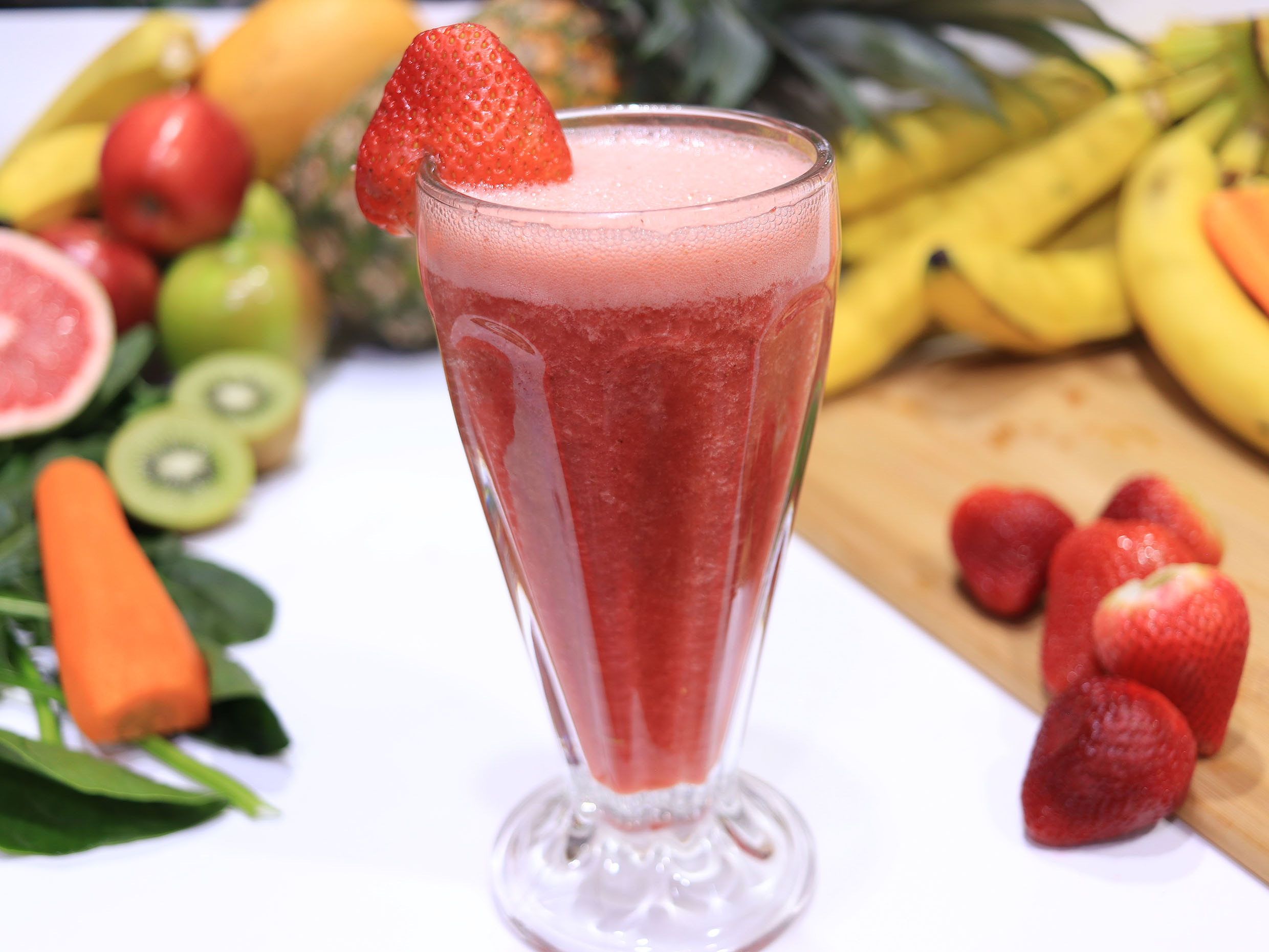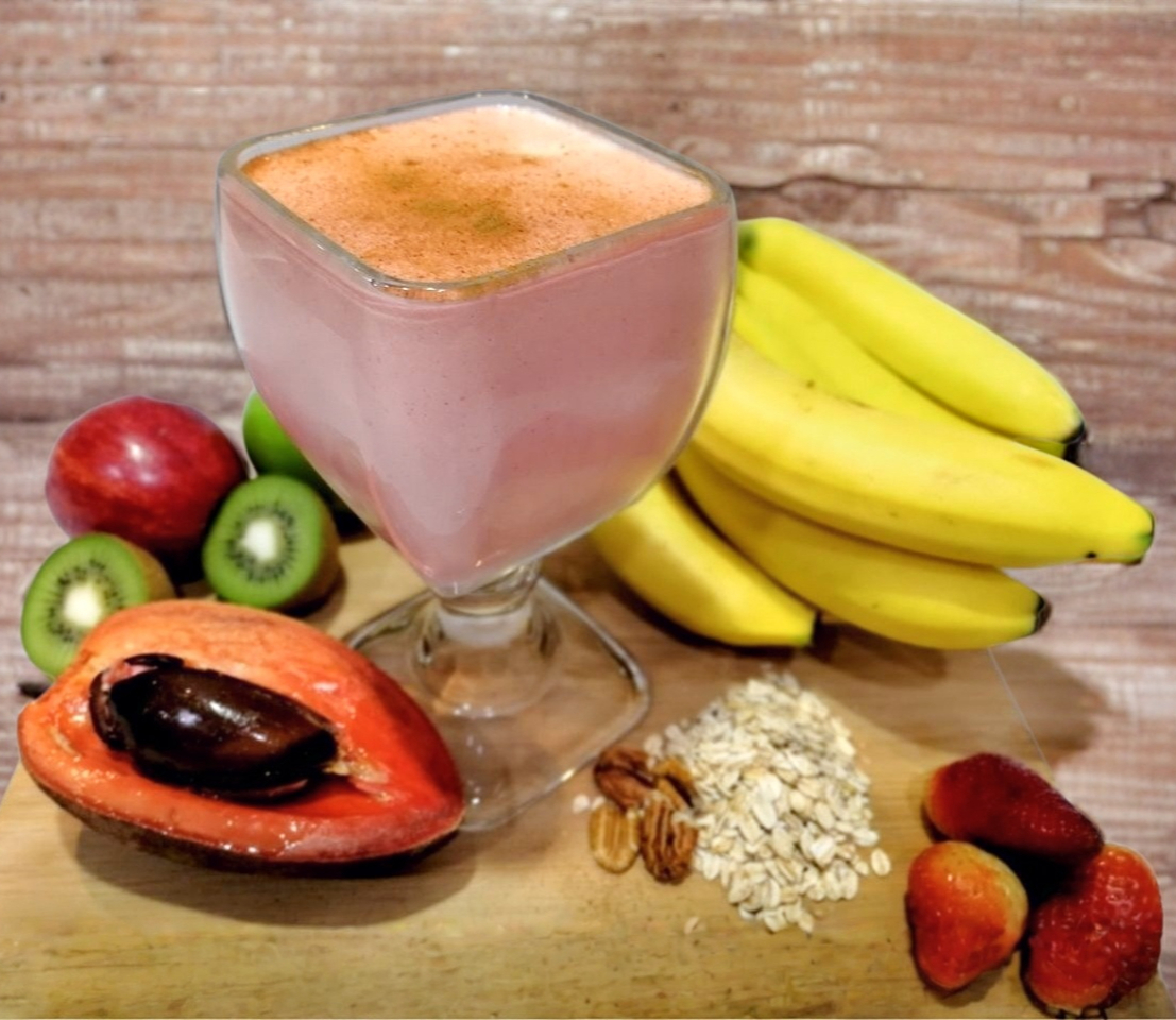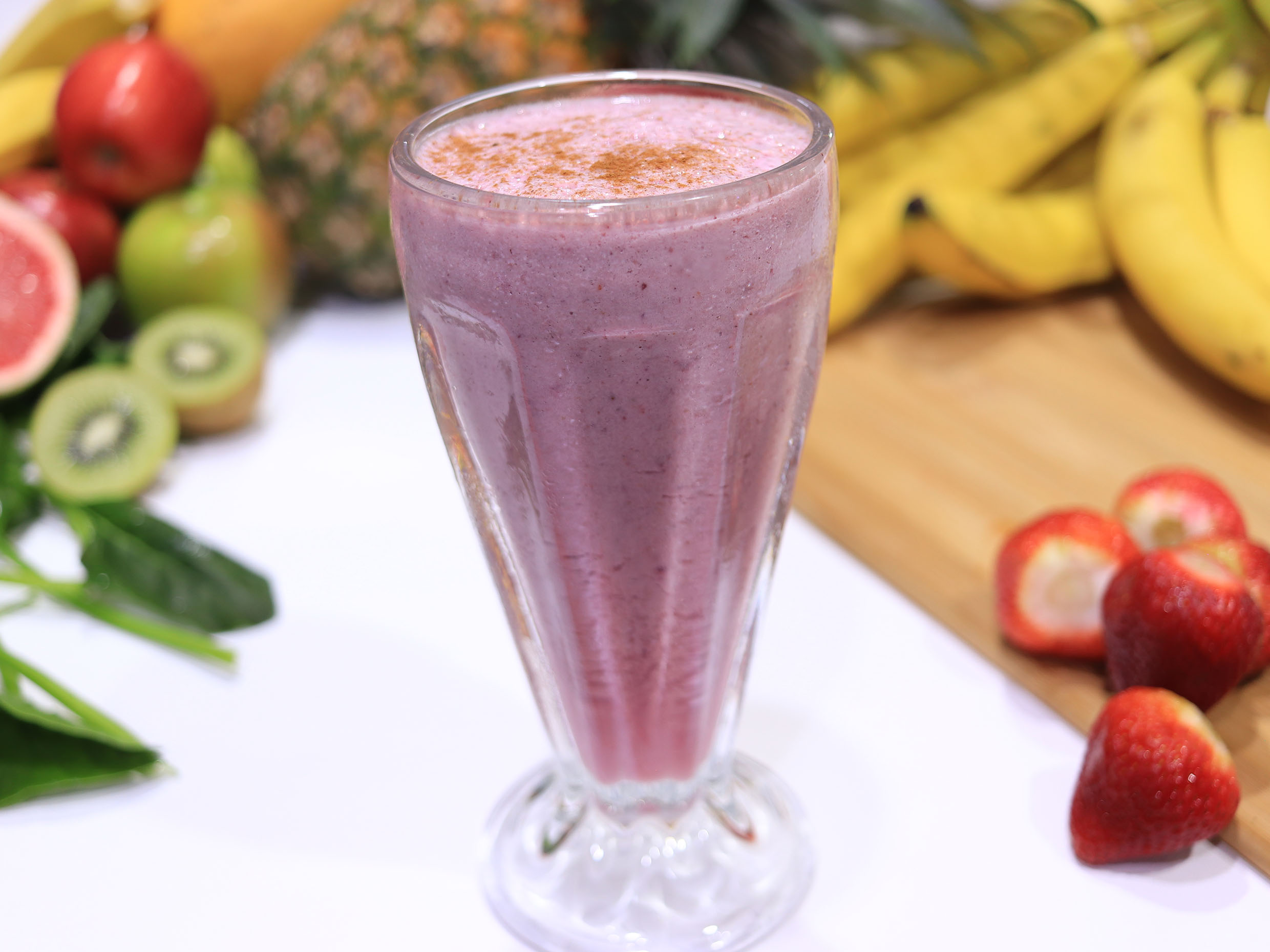 Licuado con leche, vainilla, canela y fruta a elegir.