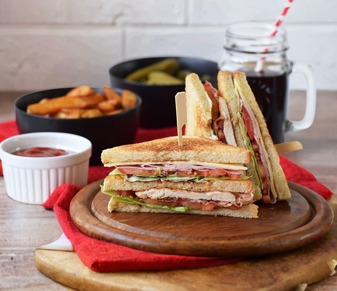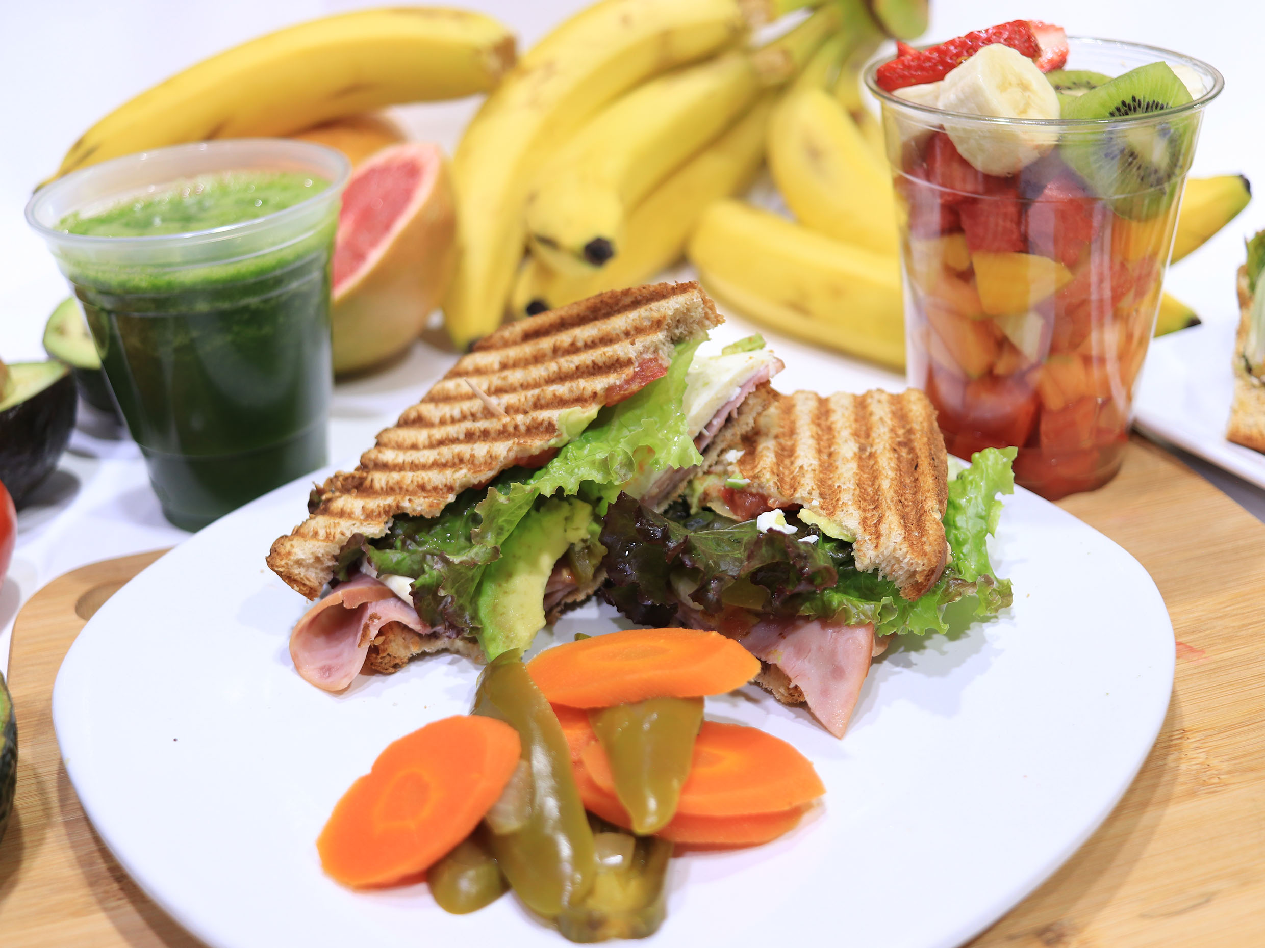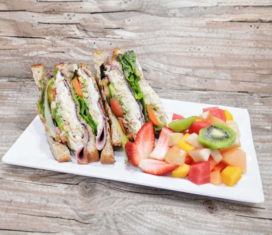 Sandwich doble; mayonesa, tomate, aguacate,rajas, quesillo, jamon, manchego ó amarillo y una carne a eleccion, acompañado de ensalada verde o de frutas.