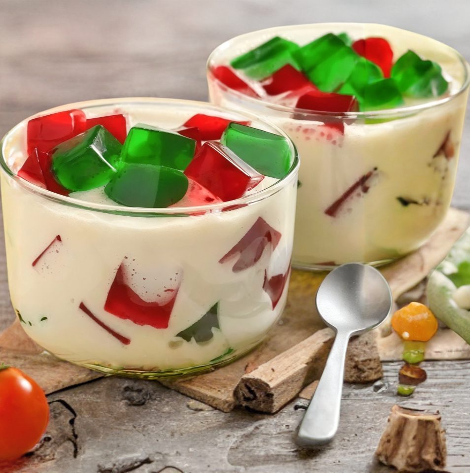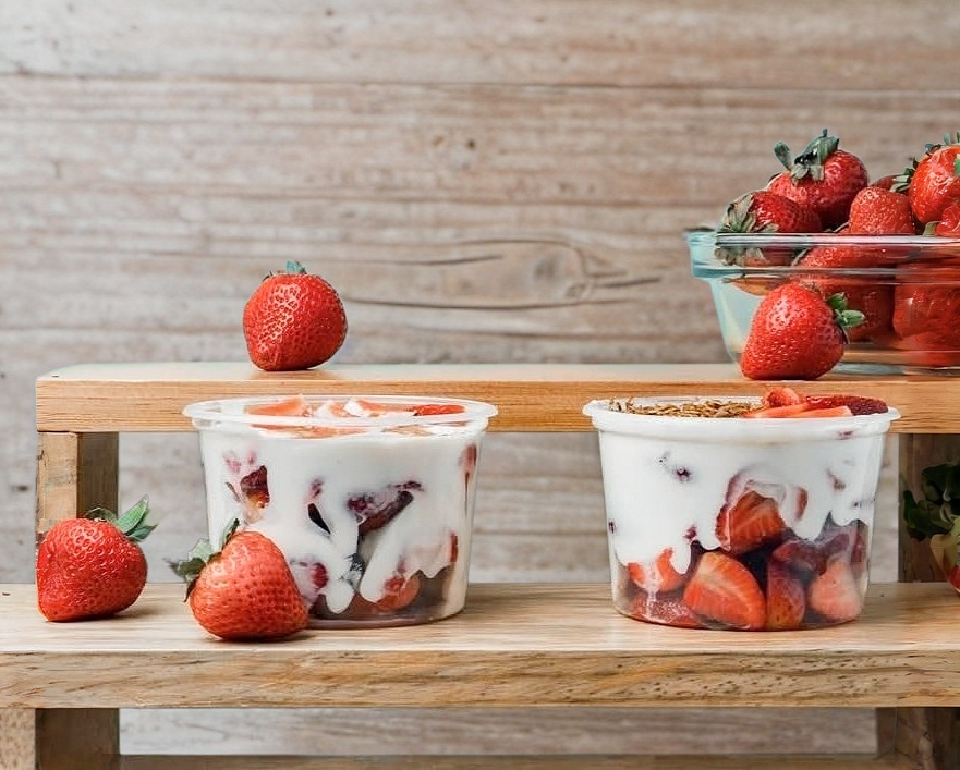 Yogurth natural de bulgaros con fruta picada, acompañado de granola, amaranto y gelatina.