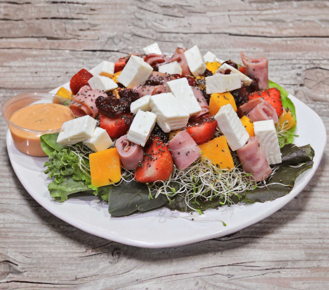 Mix de lechugas, fresa, mango , arandano, queso panela, jamon , germinado y chia.