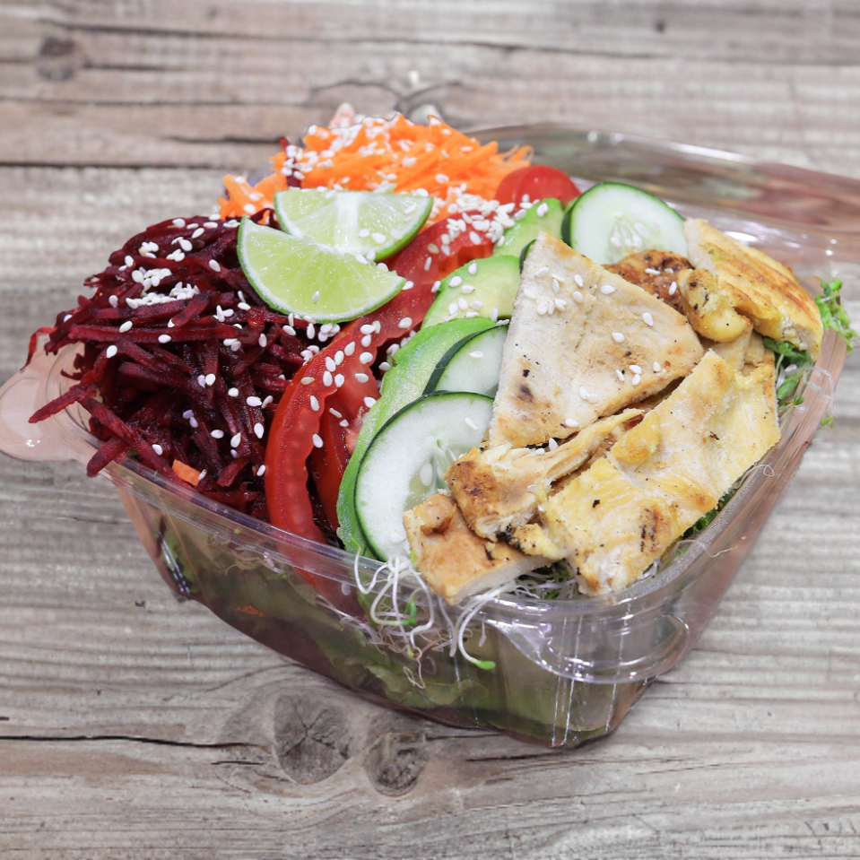 Mix de lechugas, zanahoria rallada, betabel rallado , pepino, tomate, aguacate, germinado y pechuga a la plancha