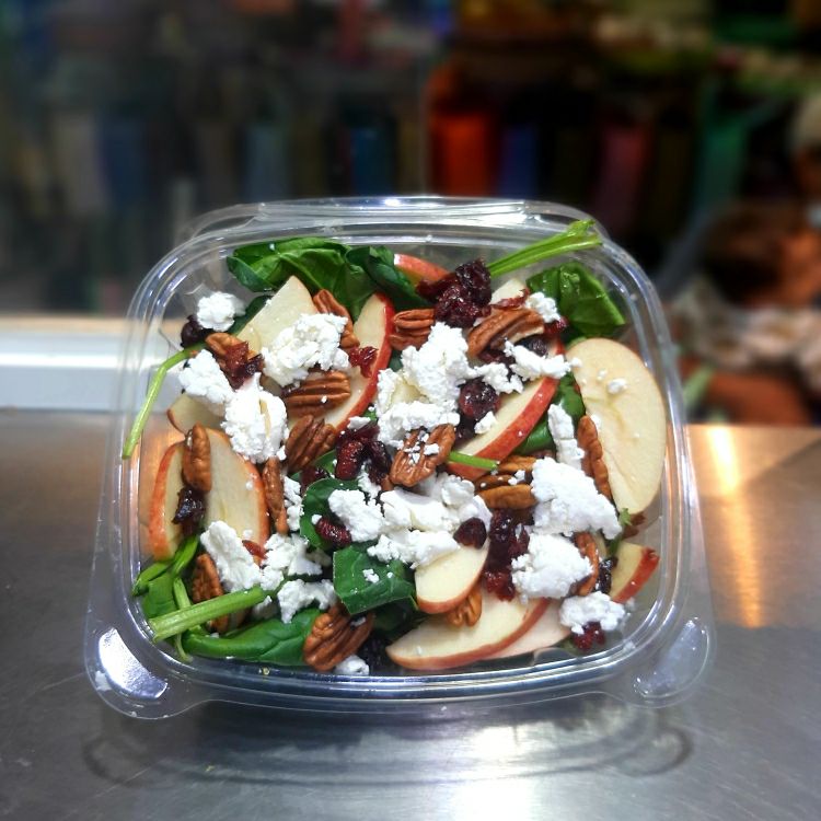 Cama de espinaca, manzana roja, arandano, nuez y queso de cabra