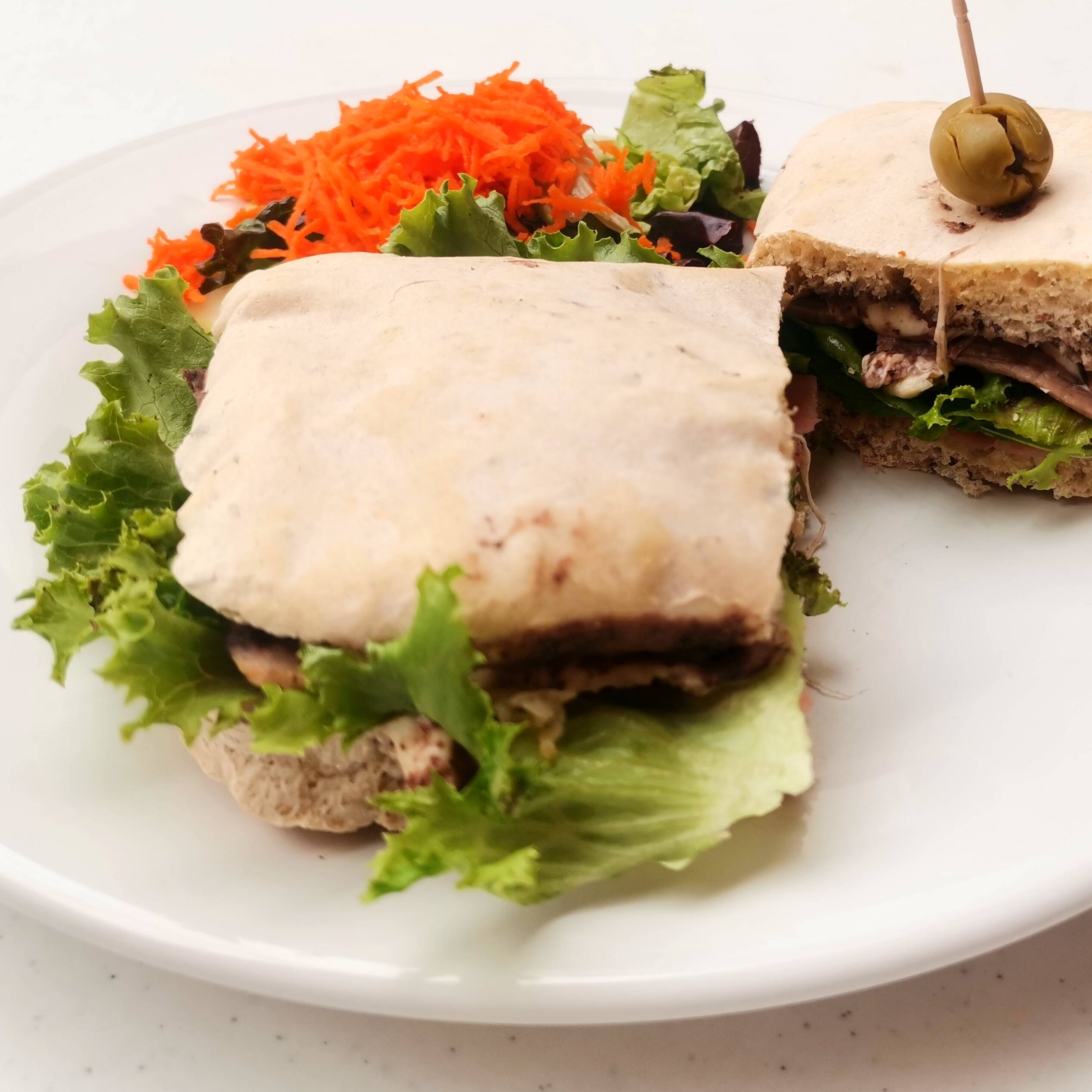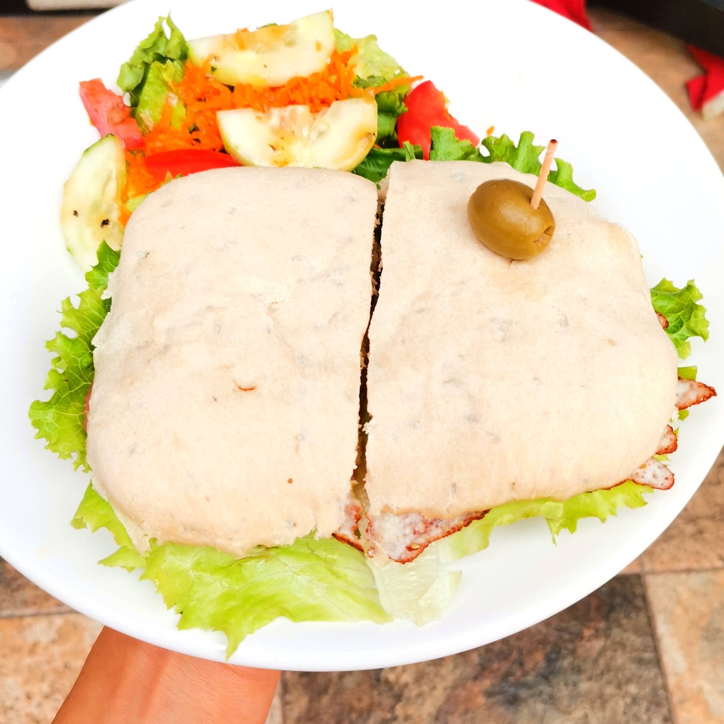 Pan ciabatta elaborado con masa madre acompañado de lechuga, tomate, aceitunas, pollo a la plancha, pimiento morrón y cebolla caramelizada.