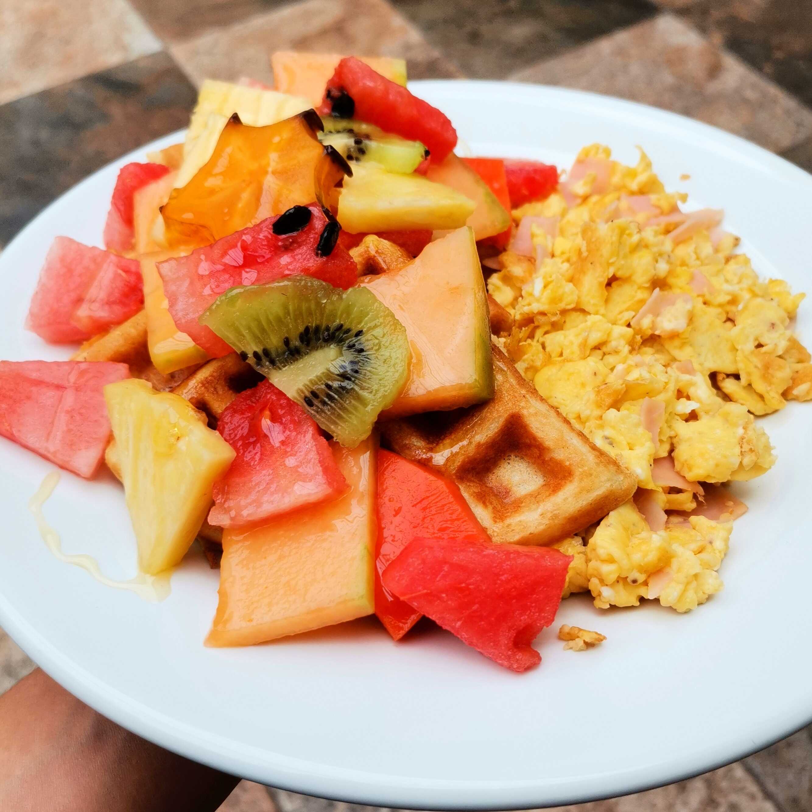 Waffle con fruta de temporada y huevo revuelto con jamon
