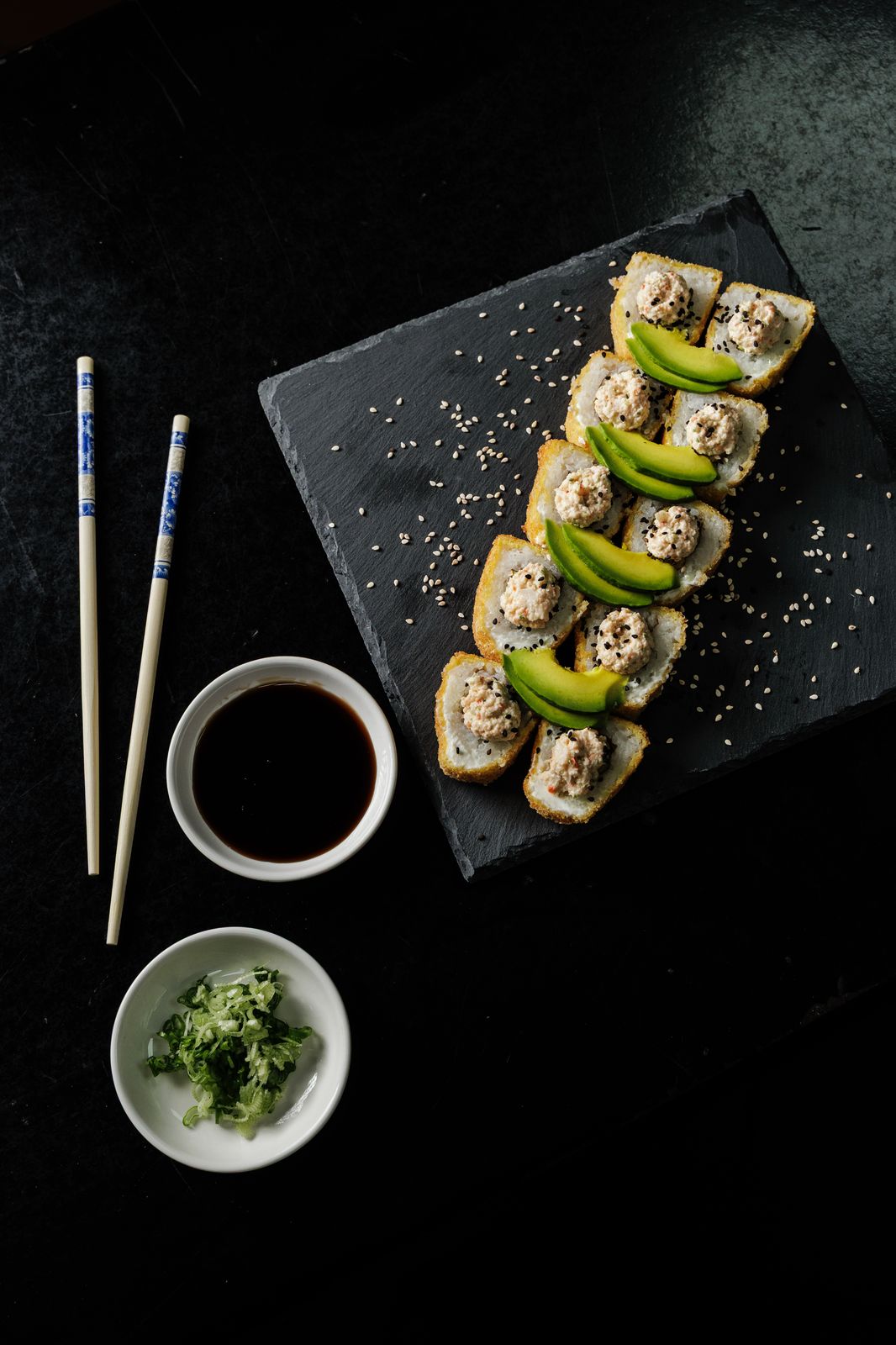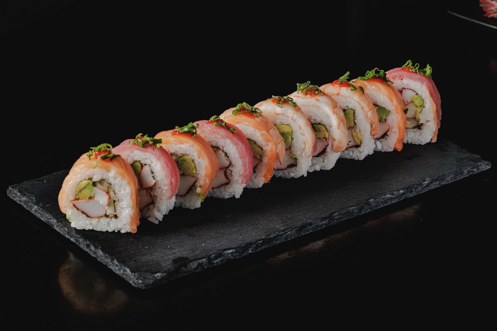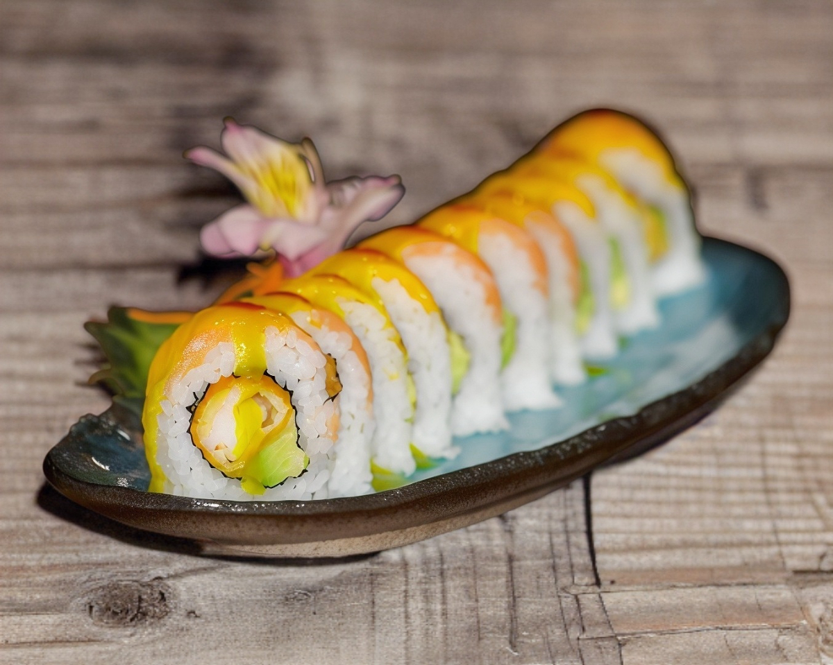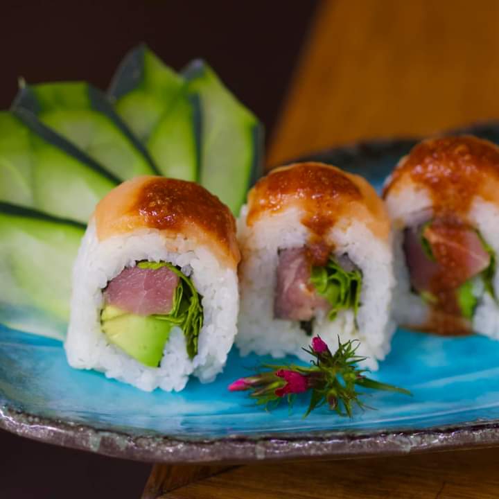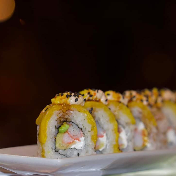 QUESO CREMA , CAMARON TEMPURA Y AGUACATE .XF MANGO , MASAGO HABANERO Y SALSA DE MANGO .