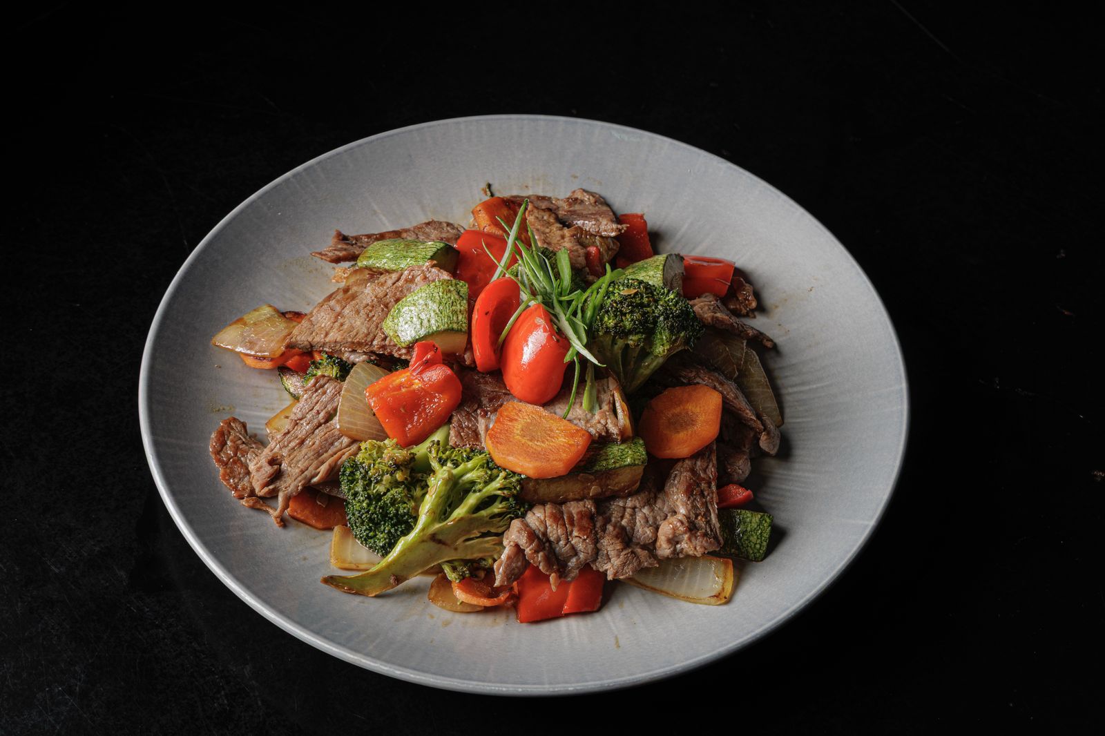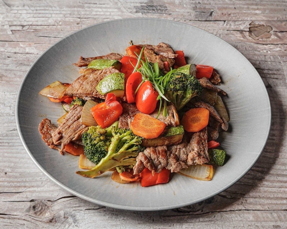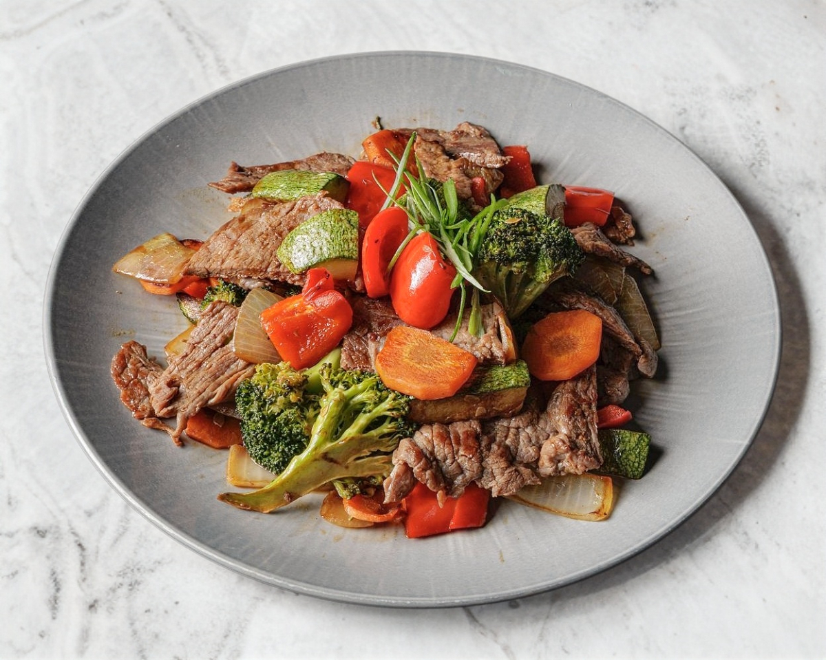 PASTA UDON , FILETE DE RES , VEGETAES , MARINADOS EN SALSA AGRIDULCE .