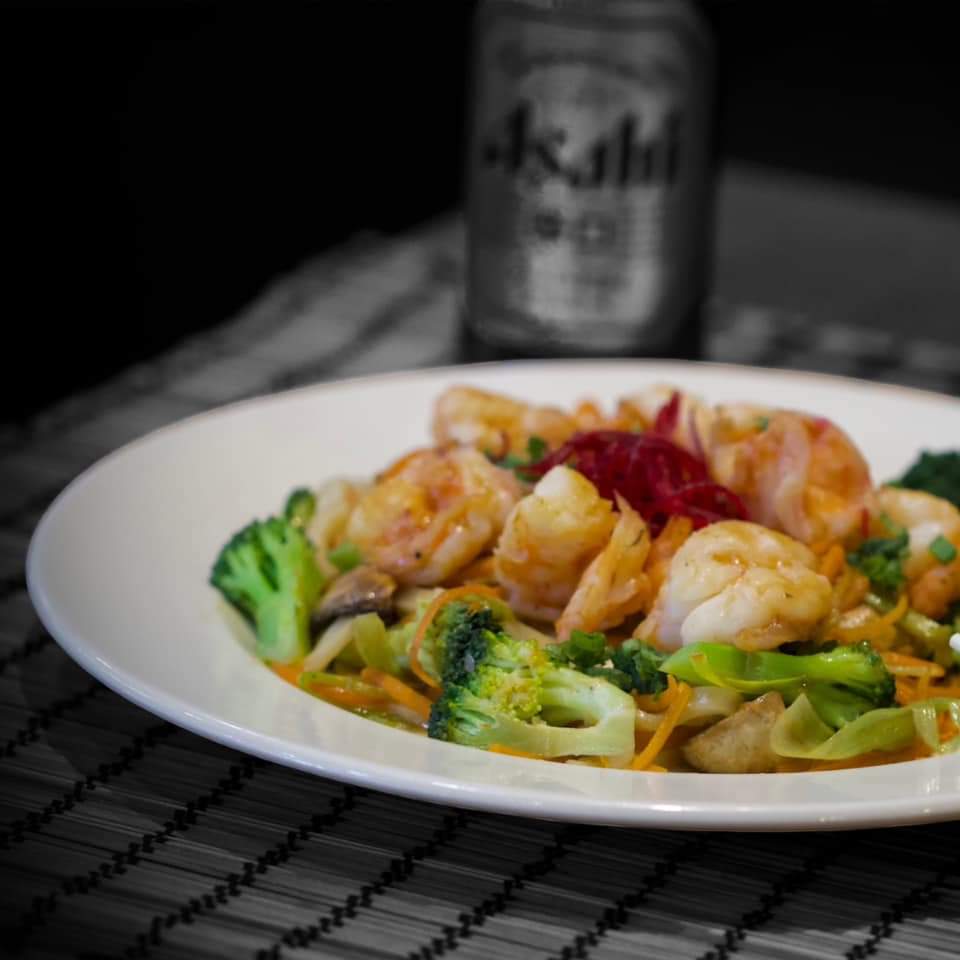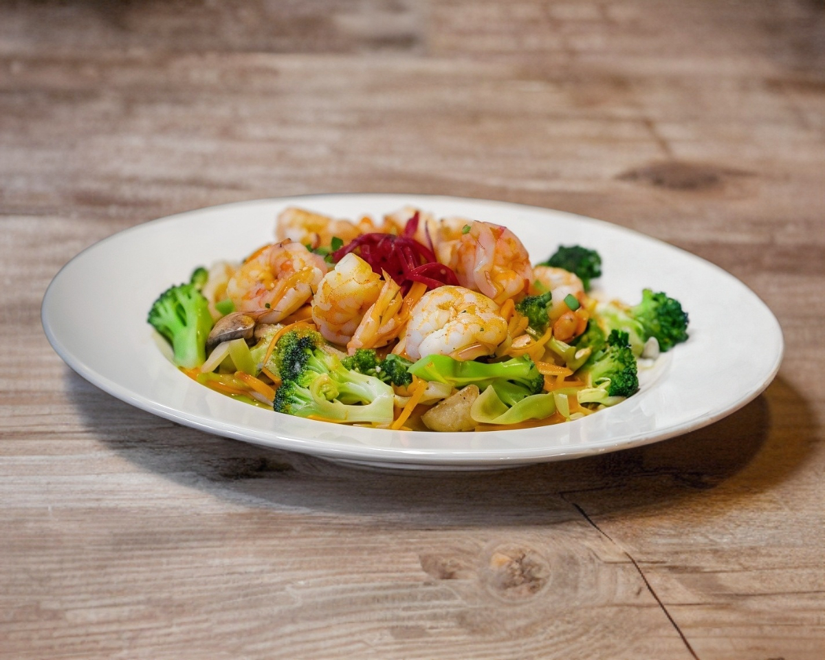 PASTA UDON , CAMARONES Y VEGETALES MARINADOS EN SALSA AGRIDULCE .