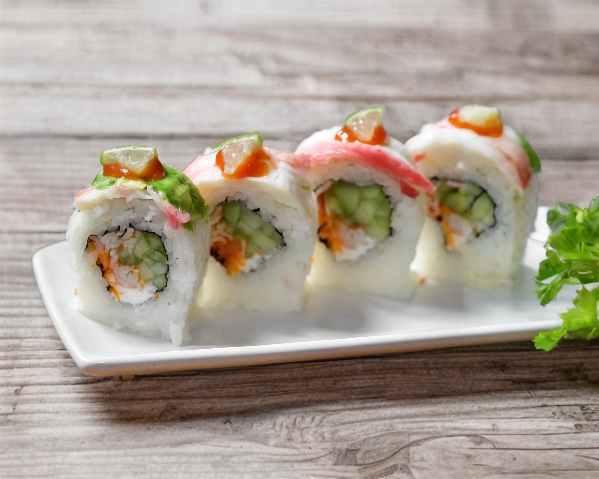 CAMARON TEMPURA , PEPINO , Y QUESO CREMA XF. PASTA DE CANGREJO, AGUACATE , FRESA Y MANGO .